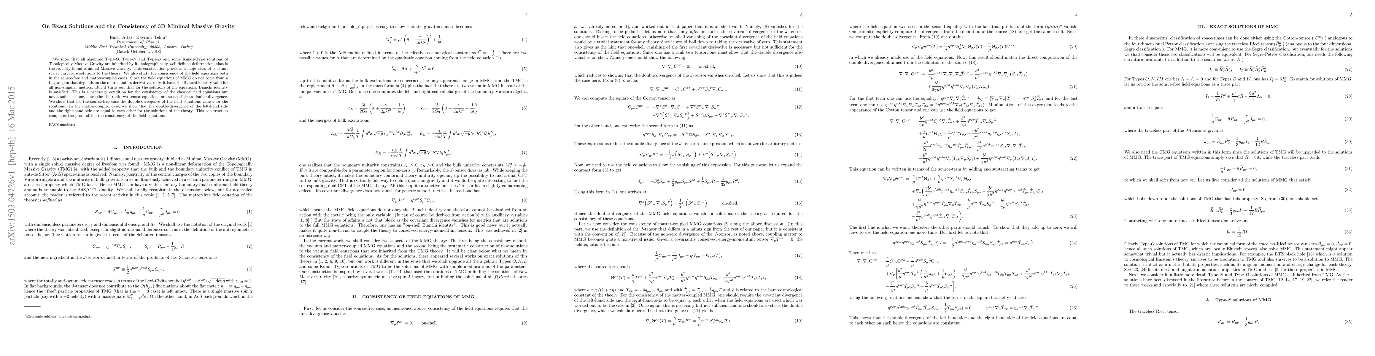 We show that all algebraic Type-O, Type-N and Type-D and some Kundt-Type solutions of Topologically Massive Gravity are inherited by its holographically well-defined deformation, that is the recently found Minimal Massive Gravity. This construction provides a large class of constant scalar curvature solutions to the theory. We also study the consistency of the field equations both in the source-free and matter-coupled cases. Since the field equations of MMG do not come from a Lagrangian that depends on the metric and its derivatives only, it lacks the Bianchi identity valid for all non-singular metrics. But it turns out that for the solutions of the equations, Bianchi identity is satisfied. This is a necessary condition for the consistency of the classical field equations but not a sufficient one, since the the rank-two tensor equations are susceptible to double-divergence. We show that for the source-free case the double-divergence of the field equations vanish for the solutions. In the matter-coupled case, we show that the double-divergence of the left-hand side and the right-hand side are equal to each other for the solutions of the theory. This construction completes the proof of the the consistency of the field equations.