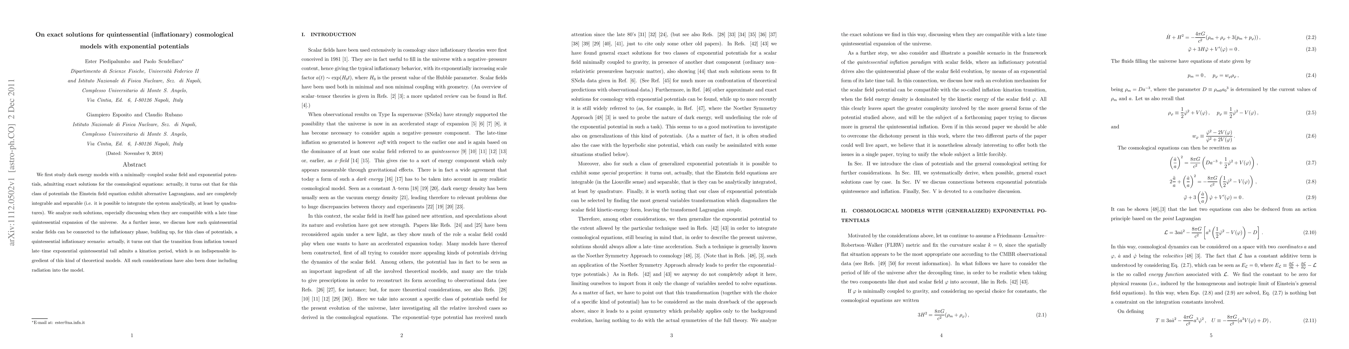 Researchers found that certain types of cosmological models with exponential potentials can have exact solutions to the Einstein field equations, allowing for a late-time quintessential expansion of the universe. These solutions also hint at a connection between inflationary phases and quintessential scenarios, including a kination period.