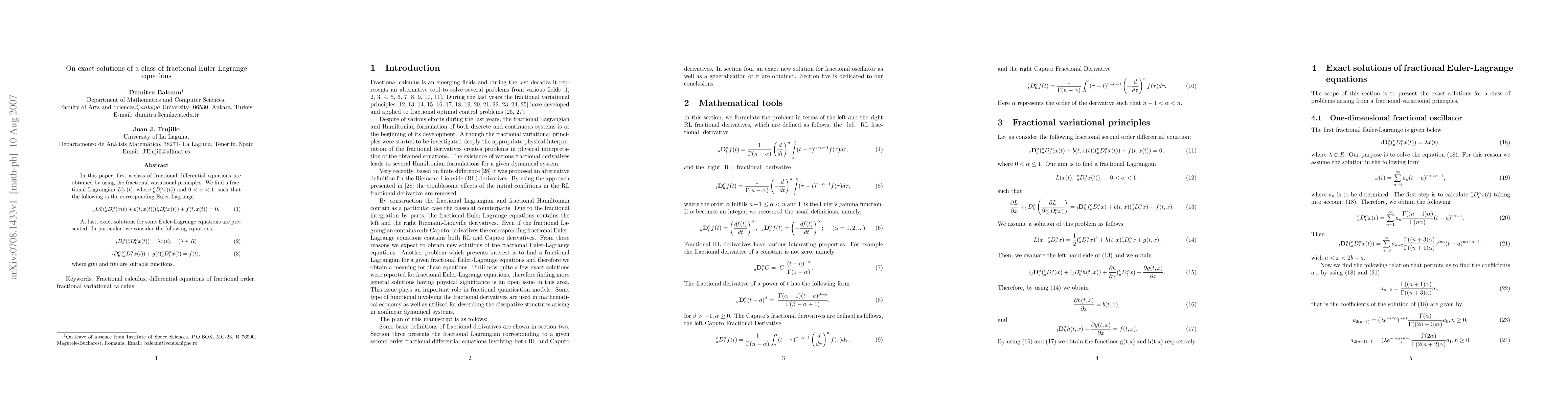 This paper explores fractional differential equations derived from fractional variational principles, identifying a fractional Lagrangian that leads to specific Euler-Lagrange equations. Exact solutions are provided for two particular forms of these equations, involving fractional derivatives with $0<\alpha<1$.