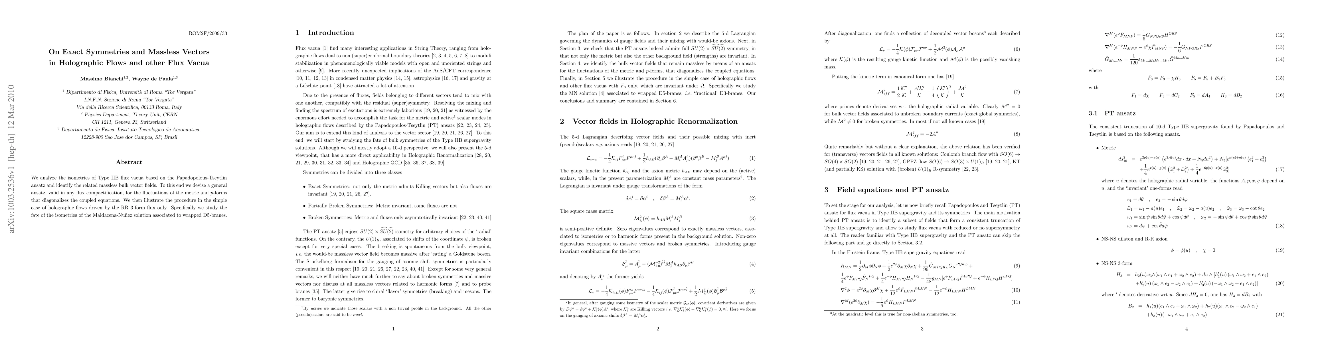 We analyze the isometries of Type IIB flux vacua based on the Papadopolous-Tseytlin ansatz and identify the related massless bulk vector fields. To this end we devise a general ansatz, valid in any flux compactification, for the fluctuations of the metric and p-forms that diagonalizes the coupled equations. We then illustrate the procedure in the simple case of holographic flows driven by the RR 3-form flux only. Specifically we study the fate of the isometries of the Maldacena-Nunez solution associated to wrapped D5-branes.
