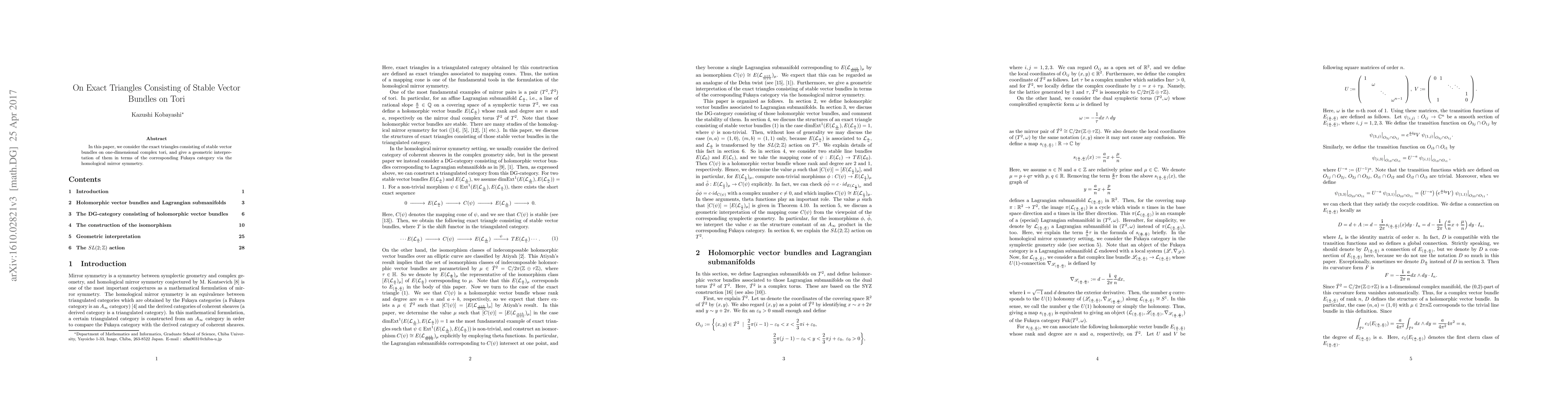 Researchers studied exact triangles of stable vector bundles on complex tori, providing a geometric interpretation via homological mirror symmetry to understand the structure of these mathematical objects.
