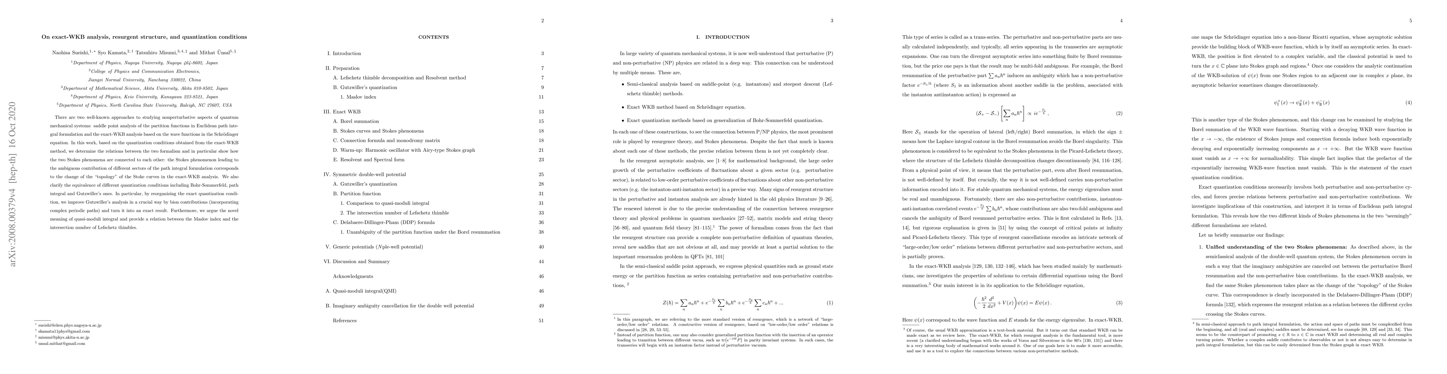 There are two well-known approaches to studying nonperturbative aspects of quantum mechanical systems: Saddle point analysis of the partition functions in Euclidean path integral formulation and the exact-WKB analysis based on the wave functions in the Schr\"{o}dinger equation. In this work, based on the quantization conditions obtained from the exact-WKB method, we determine the relations between the two formalism and in particular show how the two Stokes phenomena are connected to each other: the Stokes phenomenon leading to the ambiguous contribution of different sectors of the path integral formulation corresponds to the change of the "topology" of the Stoke curves in the exact-WKB analysis. We also clarify the equivalence of different quantization conditions including Bohr-Sommerfeld, path integral and Gutzwiller's ones. In particular, by reorganizing the exact quantization condition, we improve Gutzwiller analysis in a crucial way by bion contributions (incorporating complex periodic paths) and turn it into an exact result. Furthermore, we argue the novel meaning of quasi-moduli integral and provide a relation between the Maslov index and the intersection number of Lefschetz thimbles.