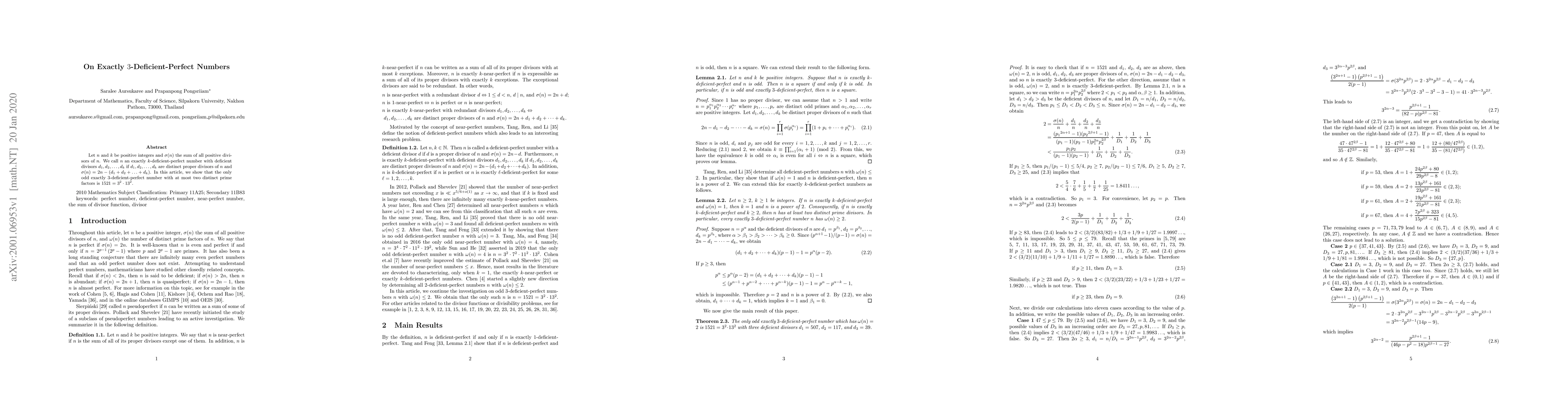 The only odd exactly 3-deficient-perfect number with at most two distinct prime factors is found to be 1521, a number composed of the primes 3 and 13.