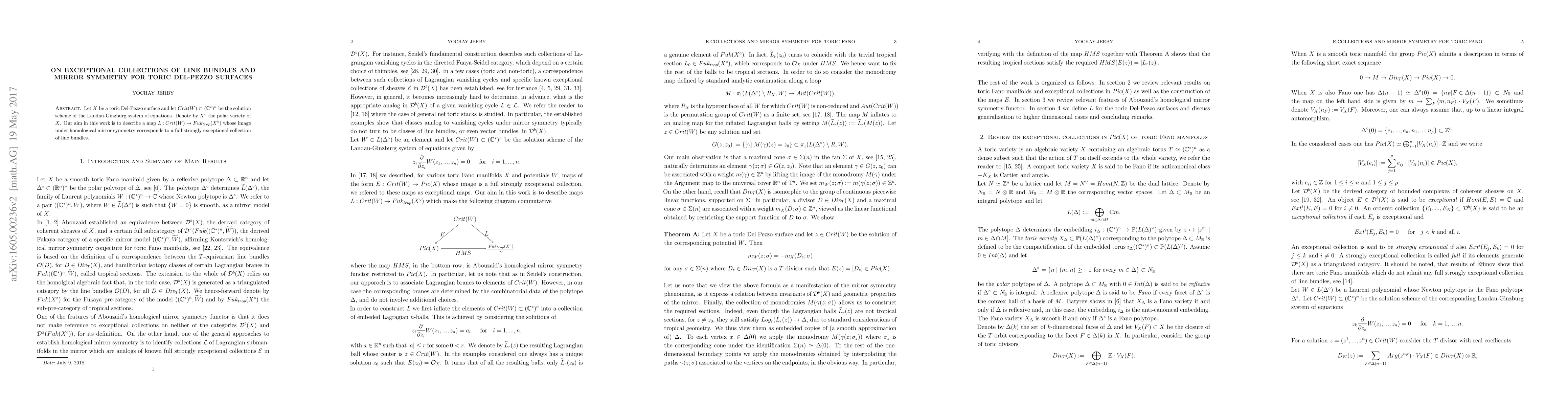 This paper investigates the relationship between toric Del-Pezzo surfaces and homological mirror symmetry by constructing a map that links the critical points of a Landau-Ginzburg potential to the Fukaya category of the polar variety, revealing a full strongly exceptional collection of line bundles.