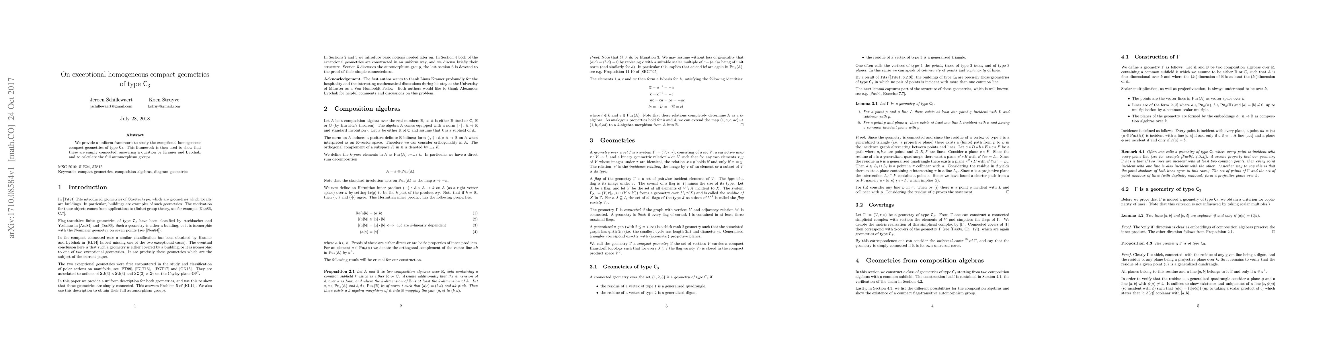 The paper provides a uniform framework to study exceptional homogeneous compact geometries of type C3, utilizing group actions and automorphism groups.