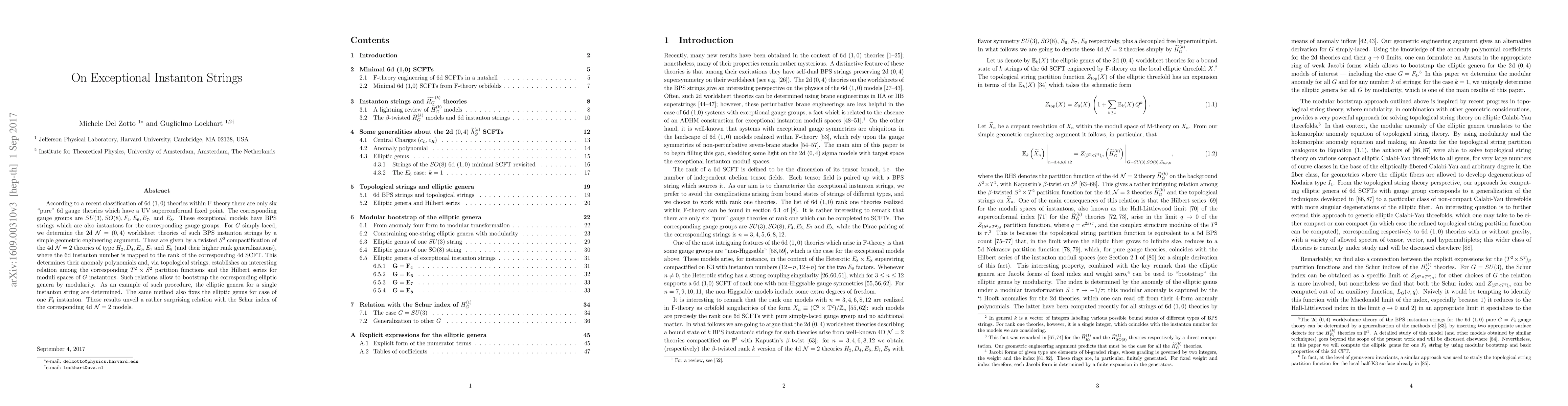 According to a recent classification of 6d (1,0) theories within F-theory there are only six "pure" 6d gauge theories which have a UV superconformal fixed point. The corresponding gauge groups are $SU(3),SO(8),F_4,E_6,E_7$, and $E_8$. These exceptional models have BPS strings which are also instantons for the corresponding gauge groups. For $G$ simply-laced, we determine the 2d $\mathcal{N}=(0,4)$ worldsheet theories of such BPS instanton strings by a simple geometric engineering argument. These are given by a twisted $S^2$ compactification of the 4d $\mathcal{N}=2$ theories of type $H_2, D_4, E_6, E_7$ and $E_8$ (and their higher rank generalizations), where the 6d instanton number is mapped to the rank of the corresponding 4d SCFT. This determines their anomaly polynomials and, via topological strings, establishes an interesting relation among the corresponding $T^2 \times S^2$ partition functions and the Hilbert series for moduli spaces of $G$ instantons. Such relations allow to bootstrap the corresponding elliptic genera by modularity. As an example of such procedure, the elliptic genera for a single instanton string are determined. The same method also fixes the elliptic genus for case of one $ F_4 $ instanton. These results unveil a rather surprising relation with the Schur index of the corresponding 4d $\mathcal{N}=2$ models.