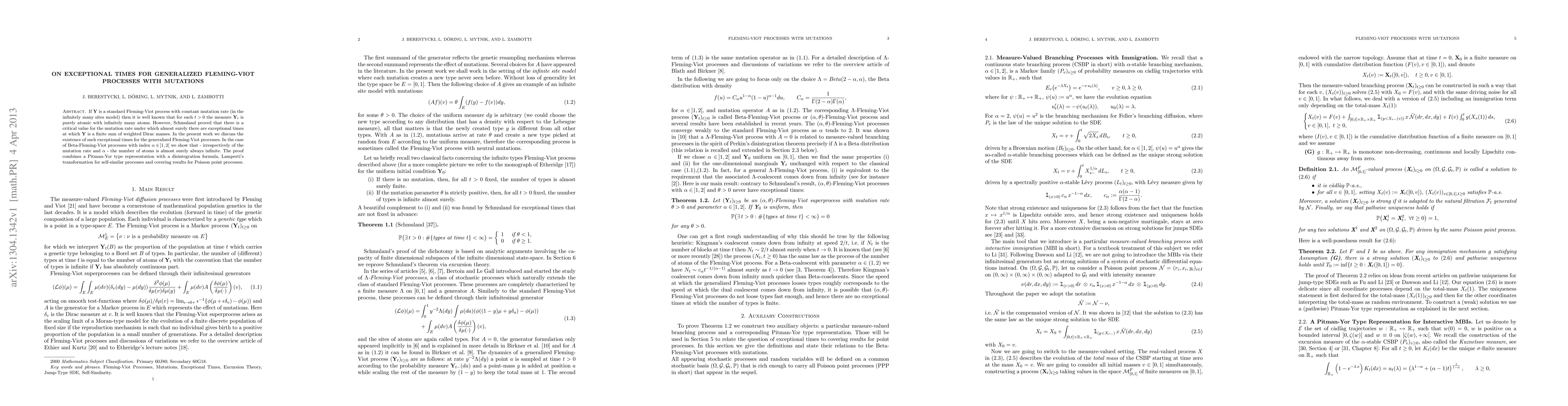 This paper investigates exceptional times in generalized Fleming-Viot processes with mutations, showing that for certain Beta-Fleming-Viot processes, the number of atoms remains almost surely infinite regardless of the mutation rate or the index $\alpha$. The proof utilizes a Pitman-Yor representation, Lamperti's transformation, and covering results for Poisson point processes.