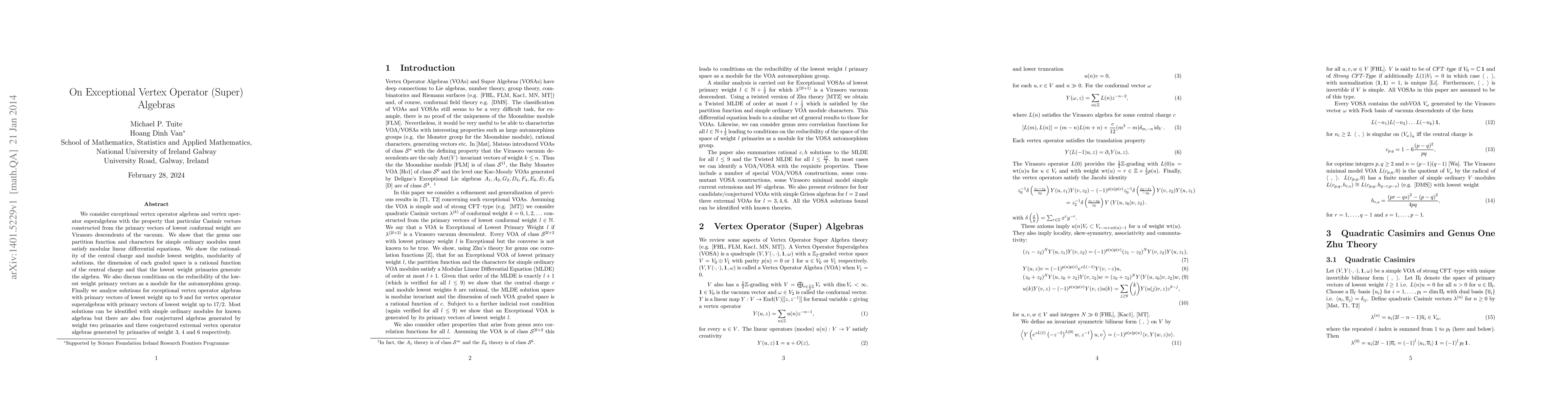This paper investigates exceptional vertex operator algebras and superalgebras, demonstrating that their partition functions and characters obey modular linear differential equations. It concludes with the rationality of central charges and module lowest weights, modularity of solutions, and discusses the reducibility of lowest weight primary vectors and specific solutions for exceptional cases.