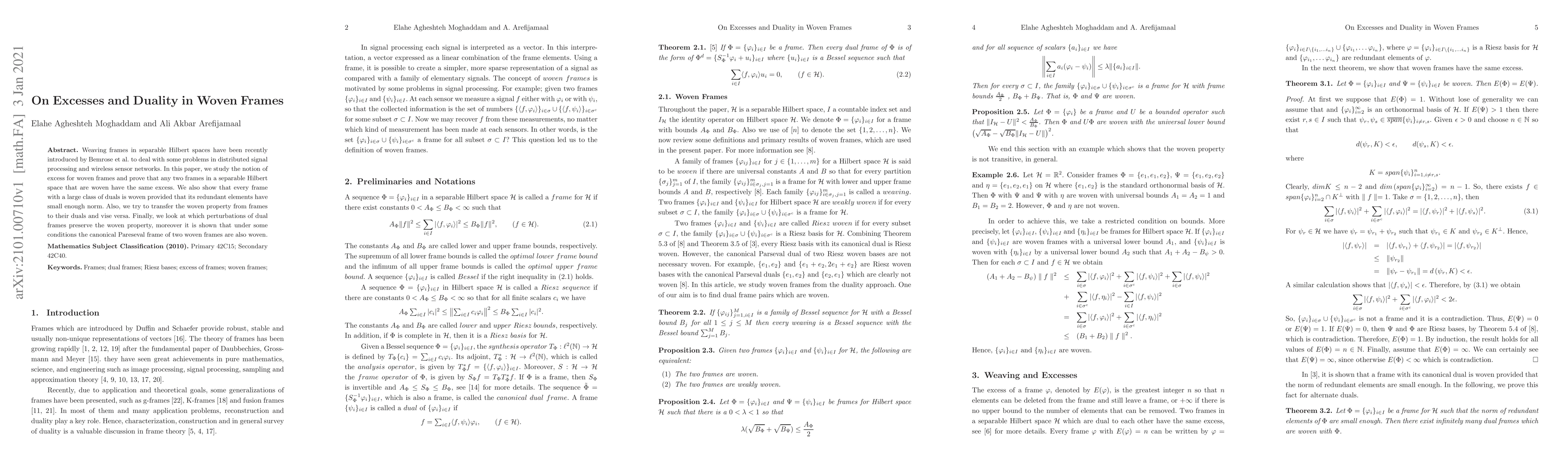 This paper explores the properties of woven frames in separable Hilbert spaces, proving that any two woven frames have the same excess. It also demonstrates that frames with a broad class of duals are woven if their redundant elements have sufficiently small norms, and investigates the transfer of the woven property between frames and their duals.