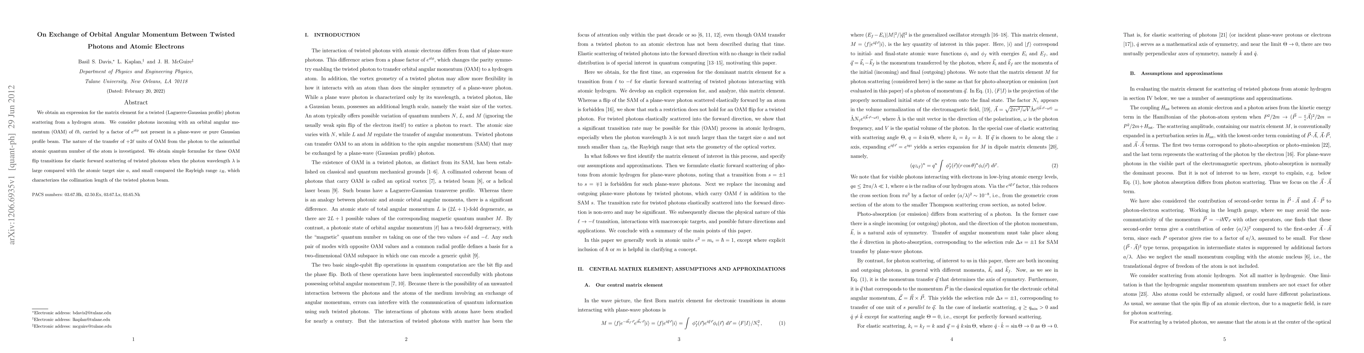 This paper derives the matrix element for twisted photon scattering from a hydrogen atom, focusing on the transfer of orbital angular momentum (OAM) from the photon to the atom's electron. It provides simple formulae for OAM flip transitions during elastic forward scattering under specific wavelength conditions.