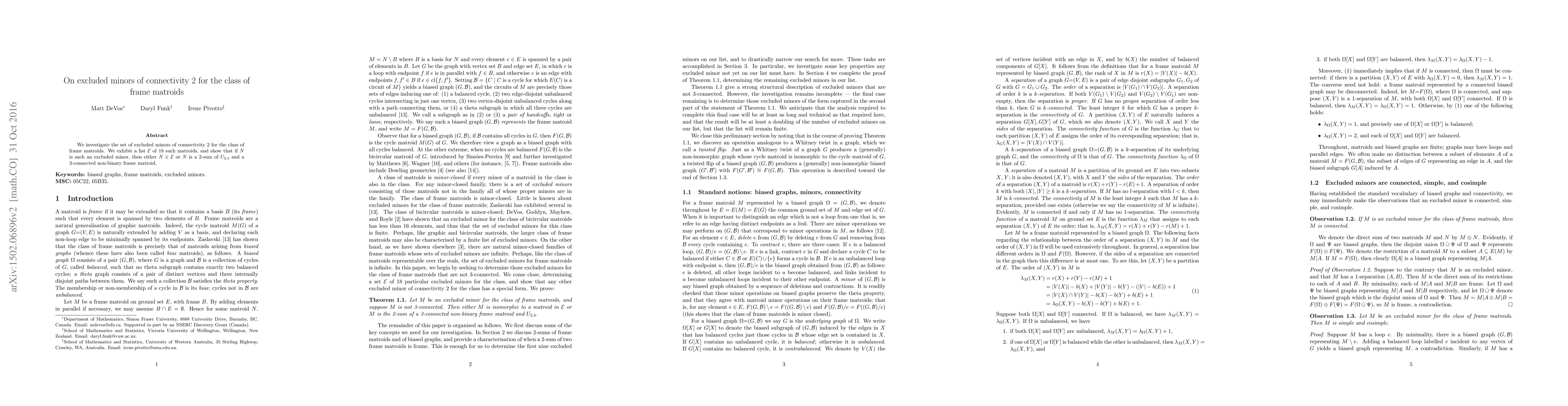 This paper identifies 18 excluded minors of connectivity 2 for frame matroids, demonstrating that any additional excluded minor is a 2-sum of $U_{2,4}$ and a 3-connected non-binary frame matroid.