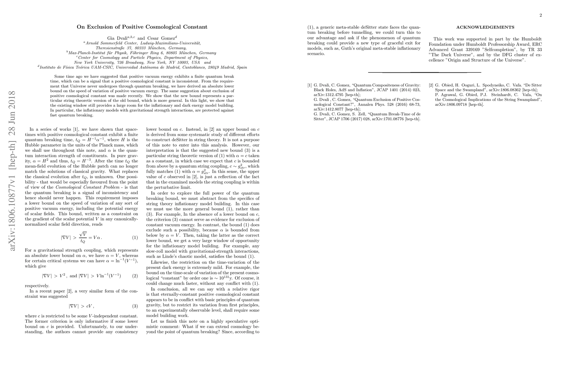 Some time ago we have suggested that positive vacuum energy exhibits a finite quantum break time, which can be a signal that a positive cosmological constant is inconsistent. From the requirement that Universe never undergoes through quantum breaking, we have derived an absolute lower bound on the speed of variation of positive vacuum energy. The same suggestion about exclusion of positive cosmological constant was made recently. We show that the new bound represents a particular string theoretic version of the old bound, which is more general. In this light, we show that the existing window still provides a large room for the inflationary and dark energy model building. In particular, the inflationary models with gravitational strength interactions, are protected against fast quantum breaking.