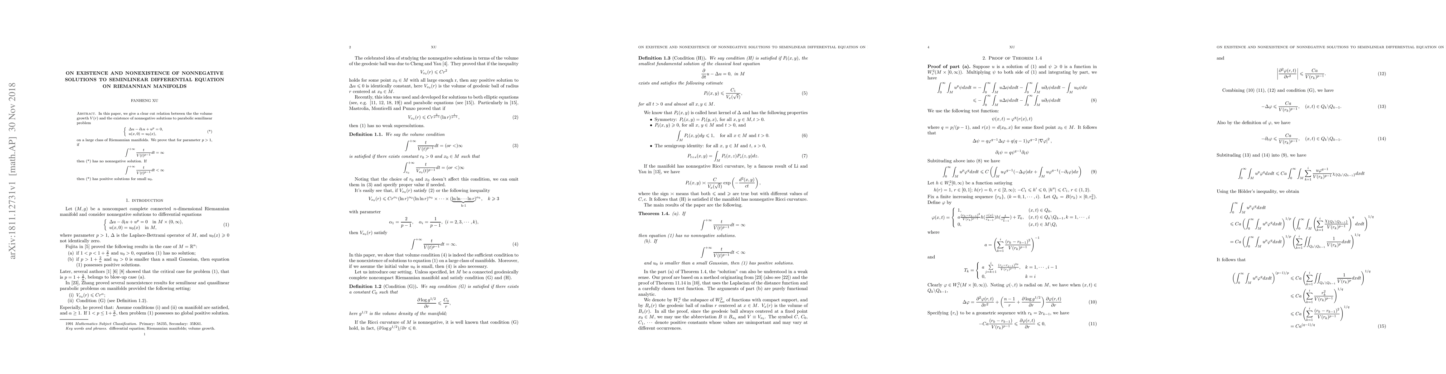 In this paper, we give a clear cut relation between the the volume growth $V(r)$ and the existence of nonnegative solutions to parabolic semilinear problem \begin{align}\tag{*}\label{*} \left\{ \begin{array}{ll} \Delta u - \partial_t u + u^p = 0, \\ {u(x,0)= {u_0(x)}}, \end{array} \right. \end{align} on a large class of Riemannian manifolds. We prove that for parameter $p>1$, if \begin{align*} \int^{+\infty} \frac{t}{V(t)^{p-1}} dt = \infty \end{align*} then (\ref{*}) has no nonnegative solution. If \begin{align*} \int^{+\infty} \frac{t}{V(t)^{p-1}} dt < \infty \end{align*} then (\ref{*}) has positive solutions for small $u_0$.