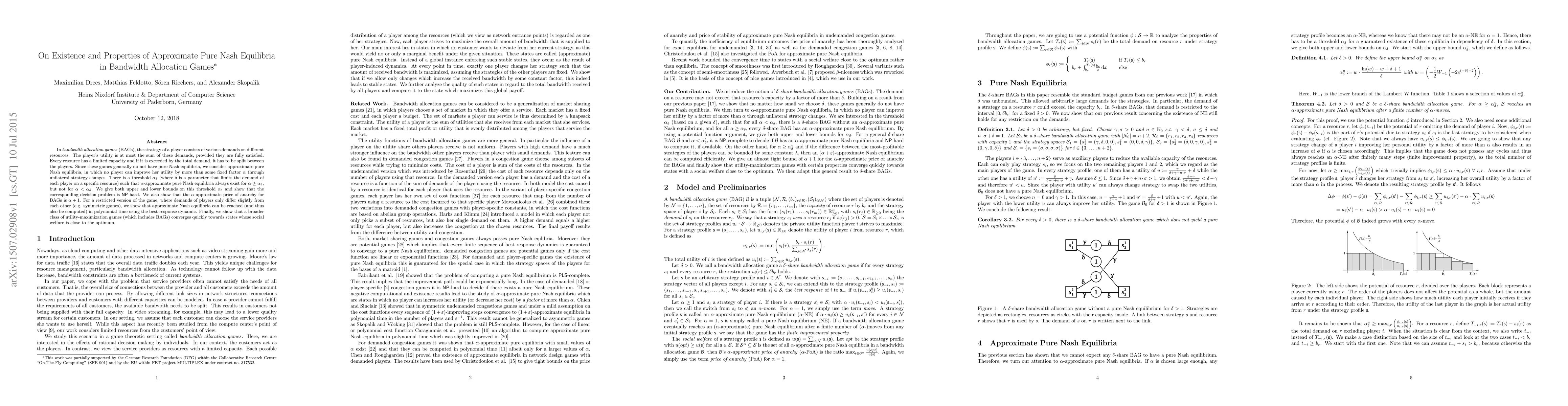 In \emph{bandwidth allocation games} (BAGs), the strategy of a player consists of various demands on different resources. The player's utility is at most the sum of these demands, provided they are fully satisfied. Every resource has a limited capacity and if it is exceeded by the total demand, it has to be split between the players. Since these games generally do not have pure Nash equilibria, we consider approximate pure Nash equilibria, in which no player can improve her utility by more than some fixed factor $\alpha$ through unilateral strategy changes. There is a threshold $\alpha_\delta$ (where $\delta$ is a parameter that limits the demand of each player on a specific resource) such that $\alpha$-approximate pure Nash equilibria always exist for $\alpha \geq \alpha_\delta$, but not for $\alpha < \alpha_\delta$. We give both upper and lower bounds on this threshold $\alpha_\delta$ and show that the corresponding decision problem is ${\sf NP}$-hard. We also show that the $\alpha$-approximate price of anarchy for BAGs is $\alpha+1$. For a restricted version of the game, where demands of players only differ slightly from each other (e.g. symmetric games), we show that approximate Nash equilibria can be reached (and thus also be computed) in polynomial time using the best-response dynamic. Finally, we show that a broader class of utility-maximization games (which includes BAGs) converges quickly towards states whose social welfare is close to the optimum.