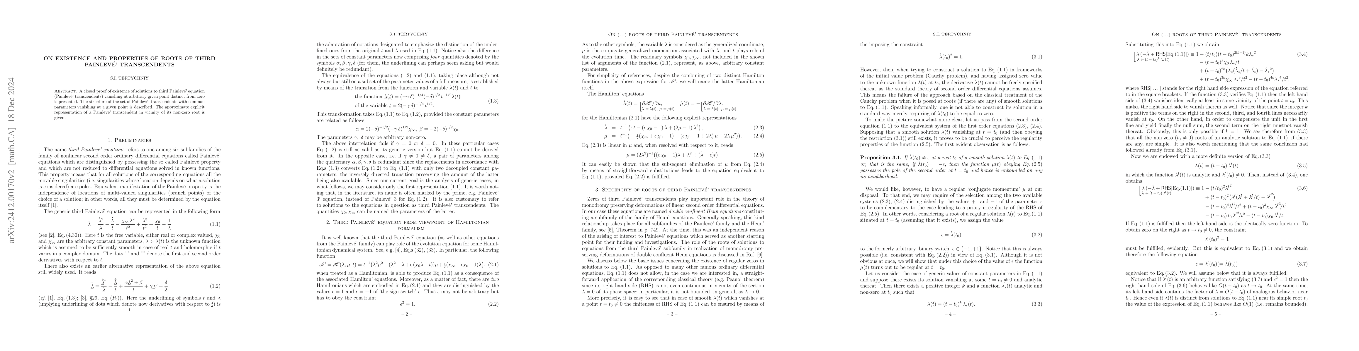A closed proof of existence of solutions to third Painlev\'e' equation (Painlev\'e' transcendents) vanishing at arbitrary given point except zero is presented. The structure of the set of Painlev\'e' transcendents with common parameters vanishing at a given point is described. The approximate explicit representation of a Painlev\'e' transcendent in vicinity of its non-zero root is given.