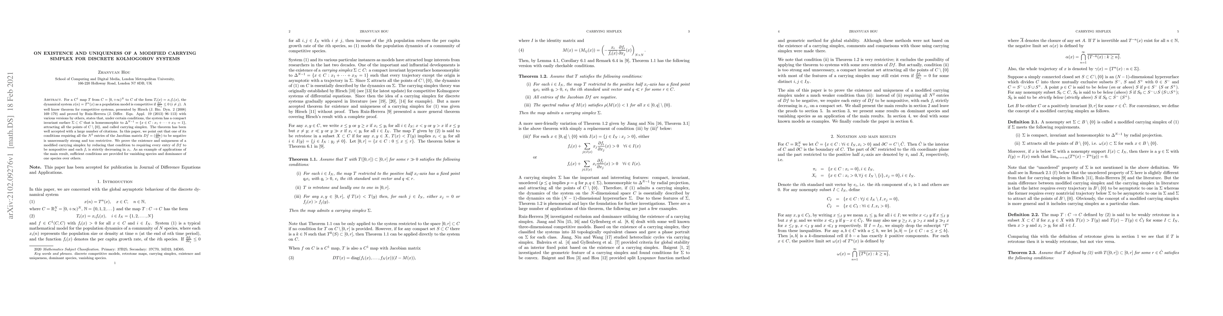 For a $C^1$ map $T$ from $C =[0, +\infty)^N$ to $C$ of the form $T_i(x) = x_if_i(x)$, the dynamical system $x(n) =T^n(x)$ as a population model is competitive if $\frac{\partial f_i}{\partial x_j}\leq 0$ $(i\not= j)$. A well know theorem for competitive systems, presented by Hirsch (J. Bio. Dyn. 2 (2008) 169--179) and proved by Ruiz-Herrera (J. Differ. Equ. Appl. 19 (2013) 96--113) with various versions by others, states that, under certain conditions, the system has a compact invariant surface $\Sigma\subset C$ that is homeomorphic to $\Delta^{N-1} =\{x\in C: x_1+ \cdots + x_N=1\}$, attracting all the points of $C\setminus\{0\}$, and called carrying simplex. The theorem has been well accepted with a large number of citations. In this paper, we point out that one of its conditions requiring all the $N^2$ entries of the Jacobian matrix $Df = (\frac{\partial f_i}{\partial x_j})$ to be negative is unnecessarily strong and too restrictive. We prove the existence and uniqueness of a modified carrying simplex by reducing that condition to requiring every entry of $Df$ to be nonpositive and each $f_i$ is strictly decreasing in $x_i$. As an example of applications of the main result, sufficient conditions are provided for vanishing species and dominance of one species over others.