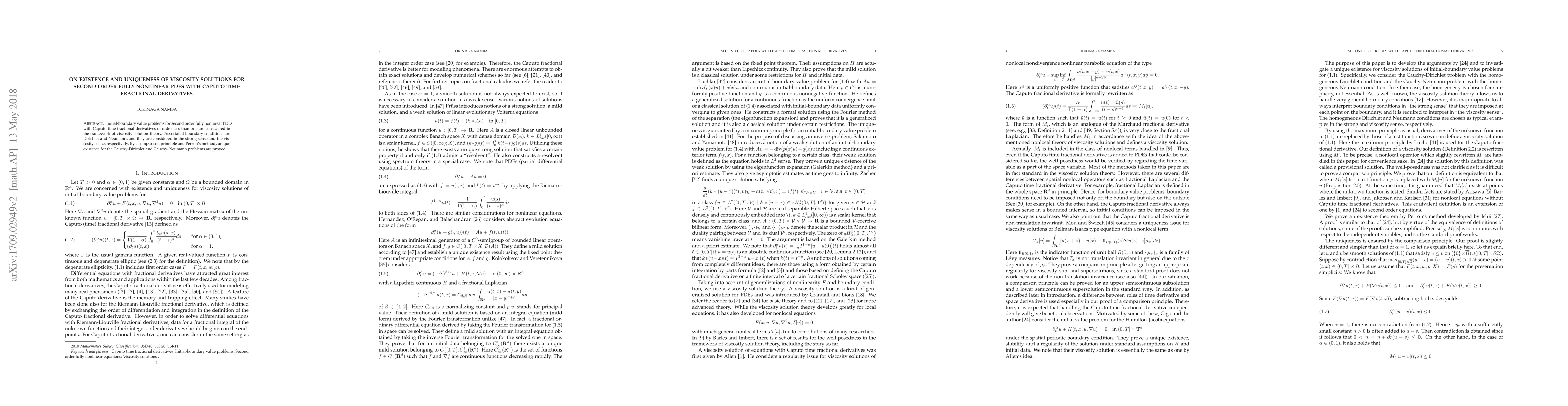 Initial-boundary value problems for second order fully nonlinear PDEs with Caputo time fractional derivatives of order less than one are considered in the framework of viscosity solution theory. Associated boundary conditions are Dirichlet and Neumann, and they are considered in the strong sense and the viscosity sense, respectively. By a comparison principle and Perron's method, unique existence for the Cauchy-Dirichlet and Cauchy-Neumann problems are proved.