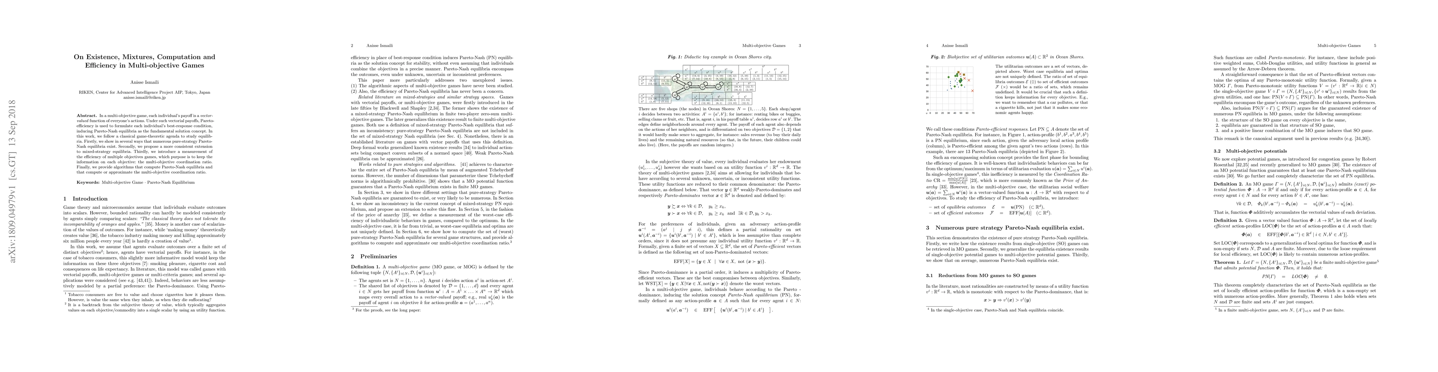 This paper explores the existence, mixtures, and computational aspects of equilibria in multi-objective games. It demonstrates the presence of numerous pure-strategy Pareto-Nash equilibria and extends this to mixed strategies. It introduces the multi-objective coordination ratio to measure efficiency and provides algorithms for computing equilibria and this ratio.