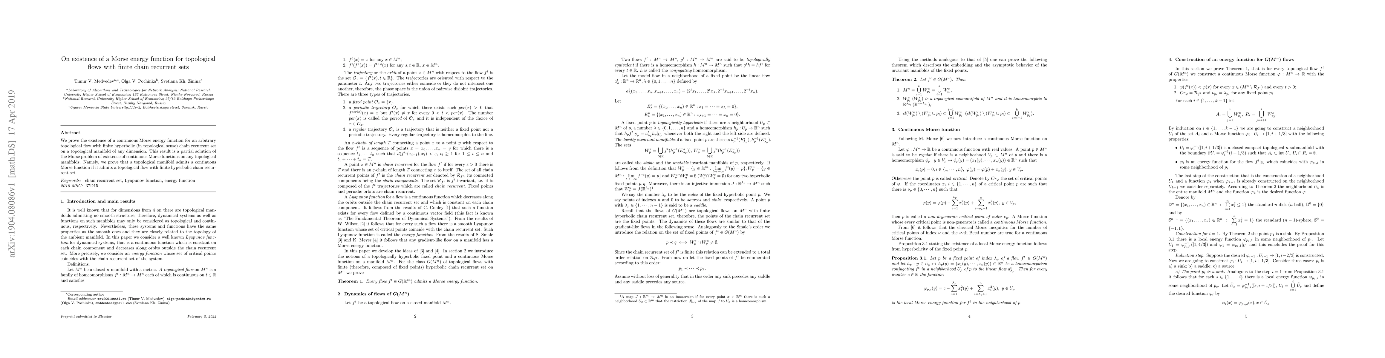 Summary: This paper demonstrates the existence of a continuous Morse energy function for topological flows with finite chain recurrent sets on any dimensional topological manifold. It provides a partial solution to the Morse problem by showing that such a manifold can host a continuous Morse function if it supports a topological flow with finite hyperbolic chain recurrent set.