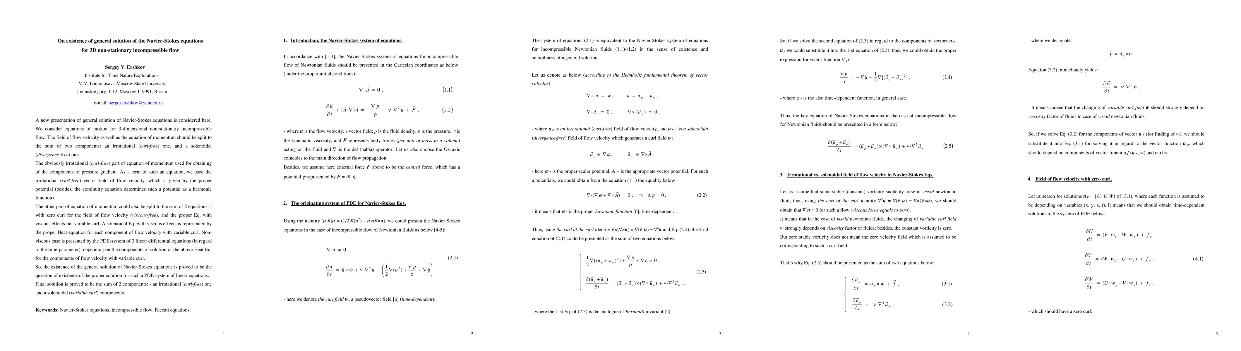 This paper presents a new approach to solving the Navier-Stokes equations for 3D non-stationary incompressible flow by decomposing the flow velocity field into irrotational and solenoidal components. The existence of a general solution is linked to the solution of a system of linear PDEs derived from the decomposed momentum equations.