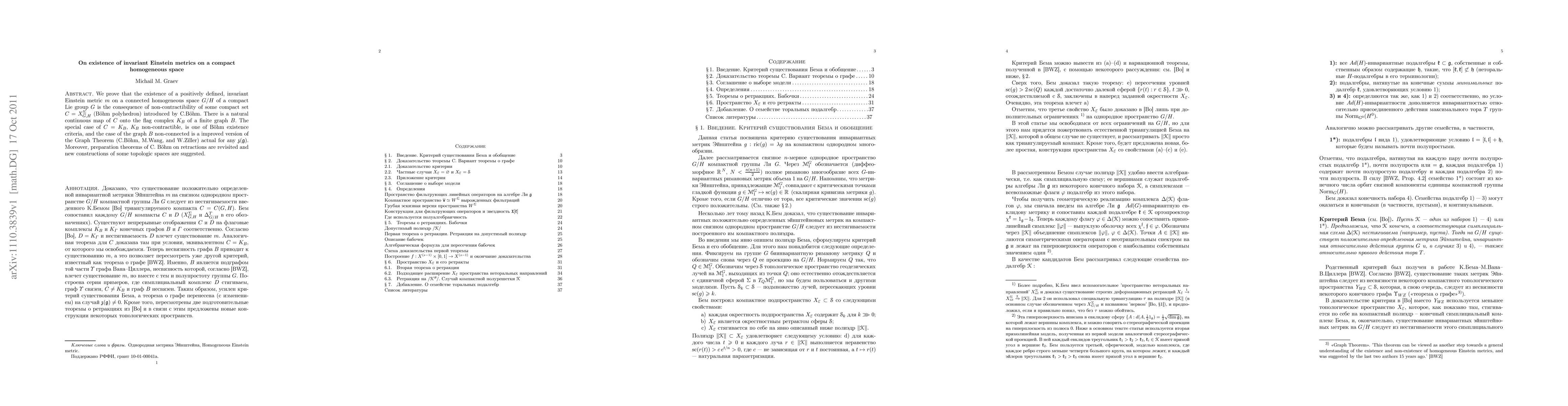 We prove that the existence of a positively defined, invariant Einstein metric $m$ on a connected homogeneous space $G/H$ of a compact Lie group $G$ is the consequence of non-contractibility of some compact set $C=X_{G,H}^{\Sigma}$ (B\"ohm polyhedron) introduced by C.B\"ohm. There is a natural continuous map of $C$ onto the flag complex $K_B$ of a finite graph $B$. The special case of $C = K_B$, $K_B$ non-contractible, is one of B\"ohm existence criteria, and the case of the graph $B$ non-connected is a improved version of the Graph Theorem (C.B\"ohm, M.Wang, and W.Ziller) actual for any $\mathfrak {z(g)}$. Moreover, preparation theorems of C. B\"ohm on retractions are revisited and new constructions of some topologic spaces are suggested.