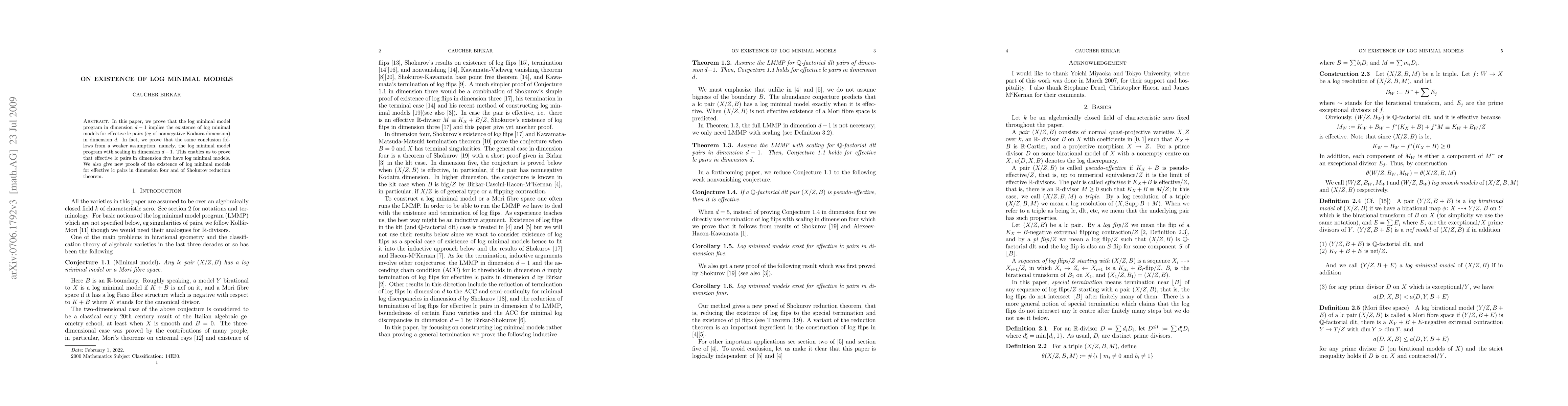 This paper establishes the existence of log minimal models for effective lc pairs in dimension $d$ based on the log minimal model program in dimension $d-1$, even under a weaker assumption. It confirms the existence for dimensions up to five and provides new proofs for dimension four and the Shokurov reduction theorem.