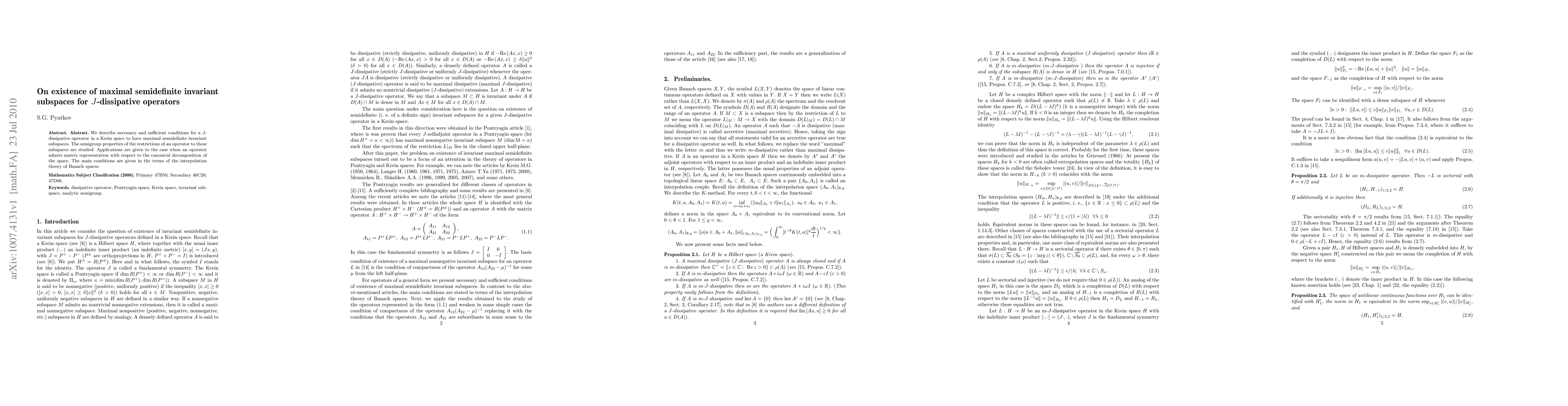 We describe necessary and sufficient conditions for a $J$-dissipative operator in a Krein space to have maximal semidefinite invariant subspaces. The semigroup properties of the restrictions of an operator to these subspaces are studied. Applications are given to the case when an operator admits matrix representation with respect to the canonical decomposition of the space. The main conditions are given in the terms of the interpolation theory of Banach spaces.