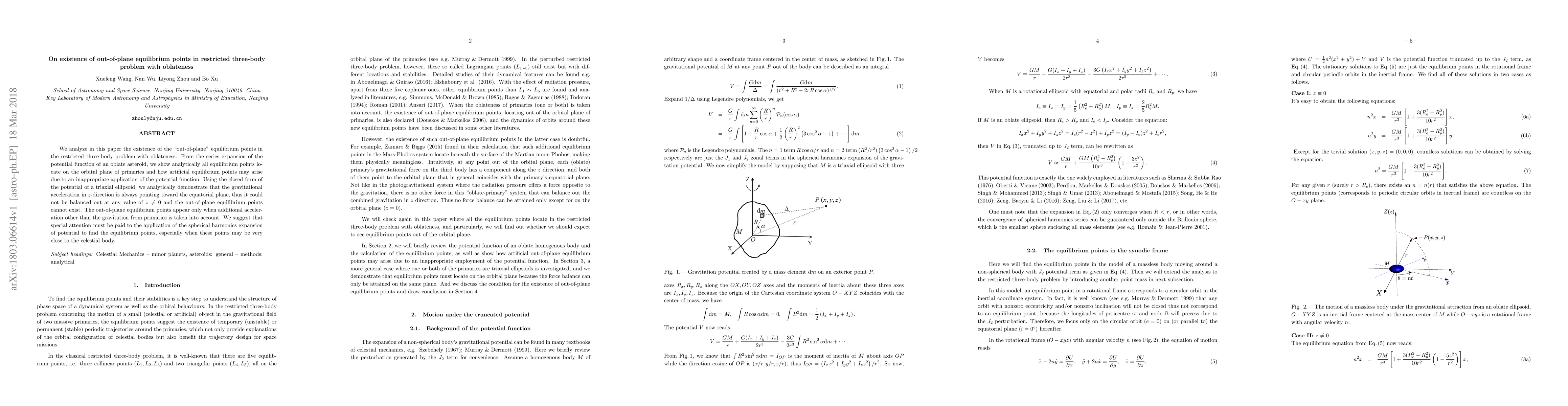 We analyze in this paper the existence of the "out-of-plane" equilibrium points in the restricted three-body problem with oblateness. From the series expansion of the potential function of an oblate asteroid, we show analytically all equilibrium points locate on the orbital plane of primaries and how artificial equilibrium points may arise due to an inappropriate application of the potential function. Using the closed form of the potential of a triaxial ellipsoid, we analytically demonstrate that the gravitational acceleration in $z$-direction is always pointing toward the equatorial plane, thus it could not be balanced out at any value of $z\neq 0$ and the out-of-plane equilibrium points cannot exist. The out-of-plane equilibrium points appear only when additional acceleration other than the gravitation from primaries is taken into account. We suggest that special attention must be paid to the application of the spherical harmonics expansion of potential to find the equilibrium points, especially when these points may be very close to the celestial body.