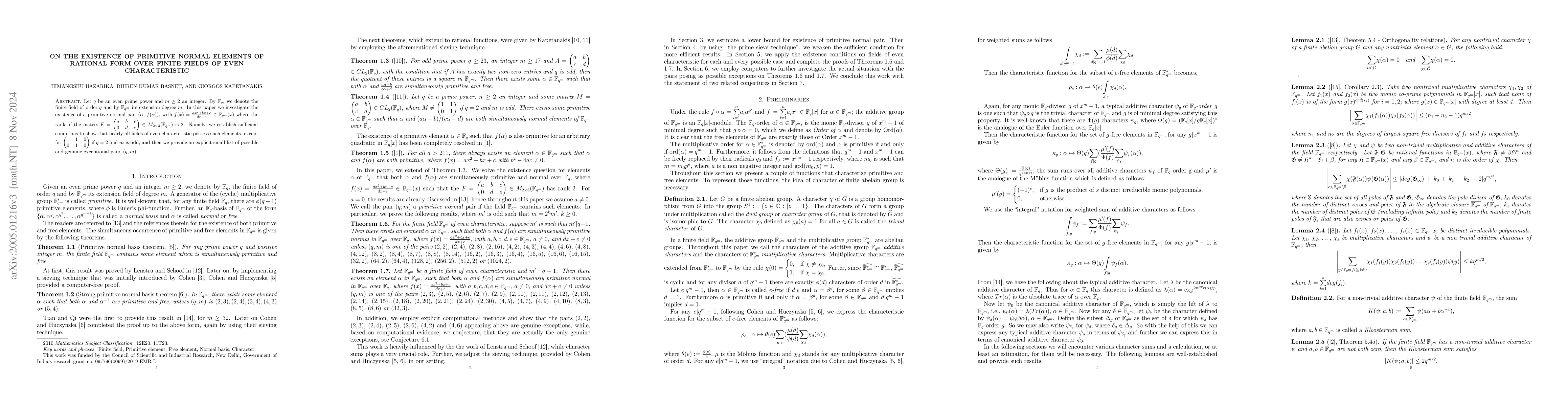 This paper explores the existence of primitive normal elements of rational form over finite fields of even characteristic, establishing sufficient conditions for their presence in nearly all such fields, with specific exceptions for certain $(q,m)$ pairs when $q=2$ and $m$ is odd.