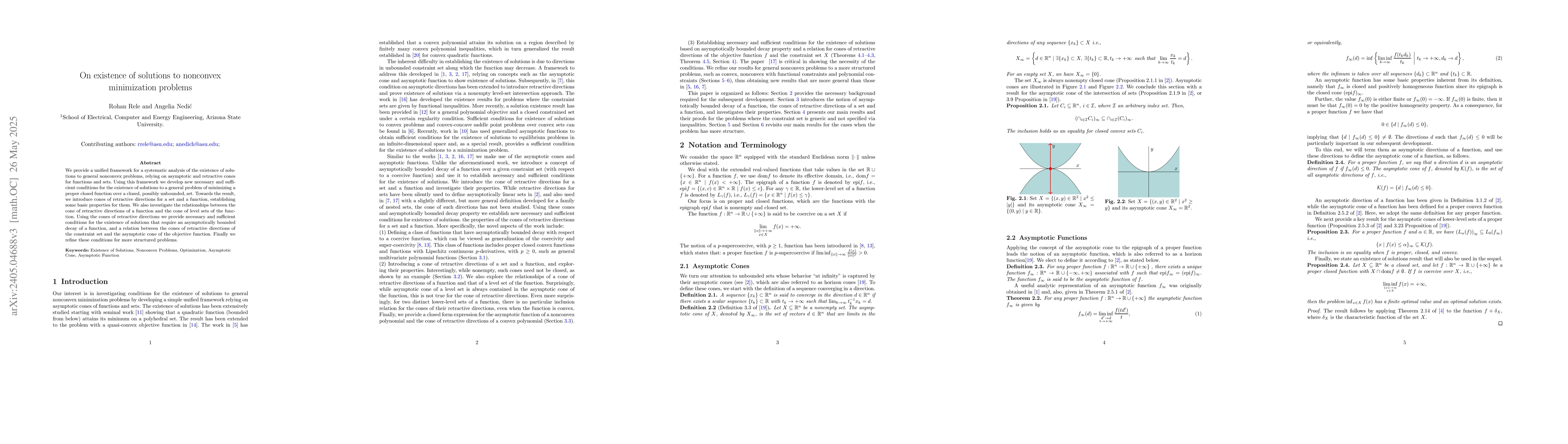This paper establishes sufficient conditions for the existence of solutions to non-convex minimization problems by introducing new criteria involving function decay and the asymptotic cone of constraints. It extends the concept of retractive directions and provides a regularization technique to generalize solution existence results beyond convex cases.