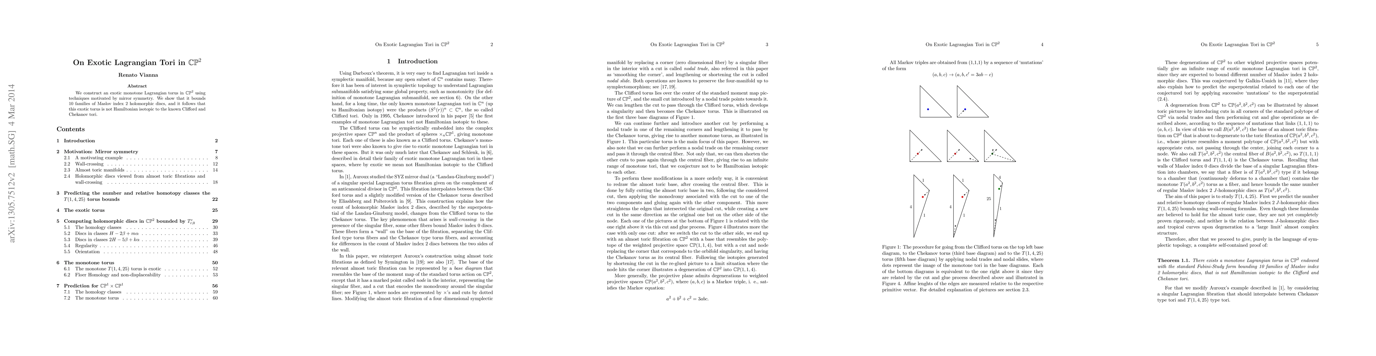 This paper constructs an exotic monotone Lagrangian torus in CP^2, demonstrating it bounds 10 families of Maslov index 2 holomorphic discs, establishing it as distinct from known Clifford and Chekanov tori via Hamiltonian isotopy.