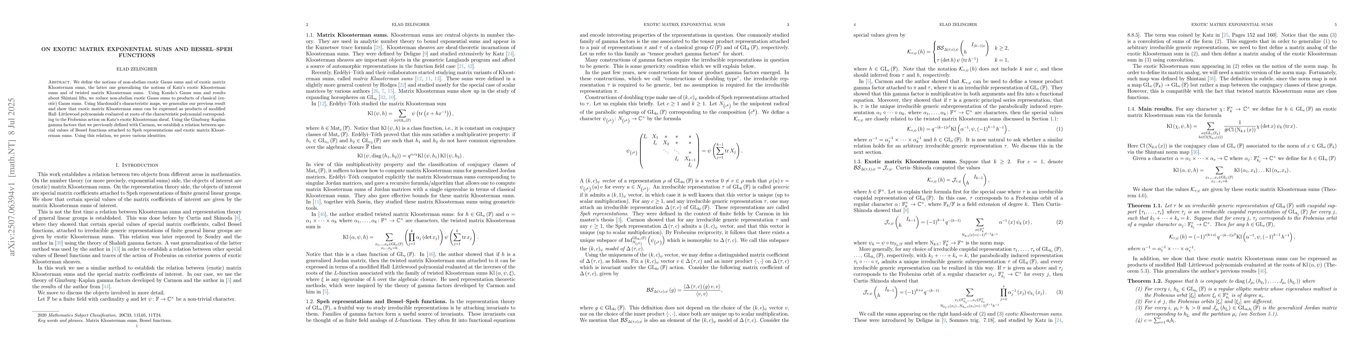 We define the notions of non-abelian exotic Gauss sums and of exotic matrix Kloosterman sums, the latter one generalizing the notions of Katz's exotic Kloosterman sums and of twisted matrix Kloosterman sums. Using Kondo's Gauss sum and results about Shintani lifts, we reduce non-abelian exotic Gauss sums to products of classical (exotic) Gauss sums. Using Macdonald's characteristic maps, we generalize our previous result and show that exotic matrix Kloosterman sums can be expressed as products of modified Hall-Littlewood polynomials evaluated at roots of the characteristic polynomial corresponding to the Frobenius action on Katz's exotic Kloosterman sheaf. Using the Ginzburg-Kaplan gamma factors that we previously defined with Carmon, we establish a relation between special values of Bessel functions attached to Speh representations and exotic matrix Kloosterman sums. Using this relation, we prove various identities.