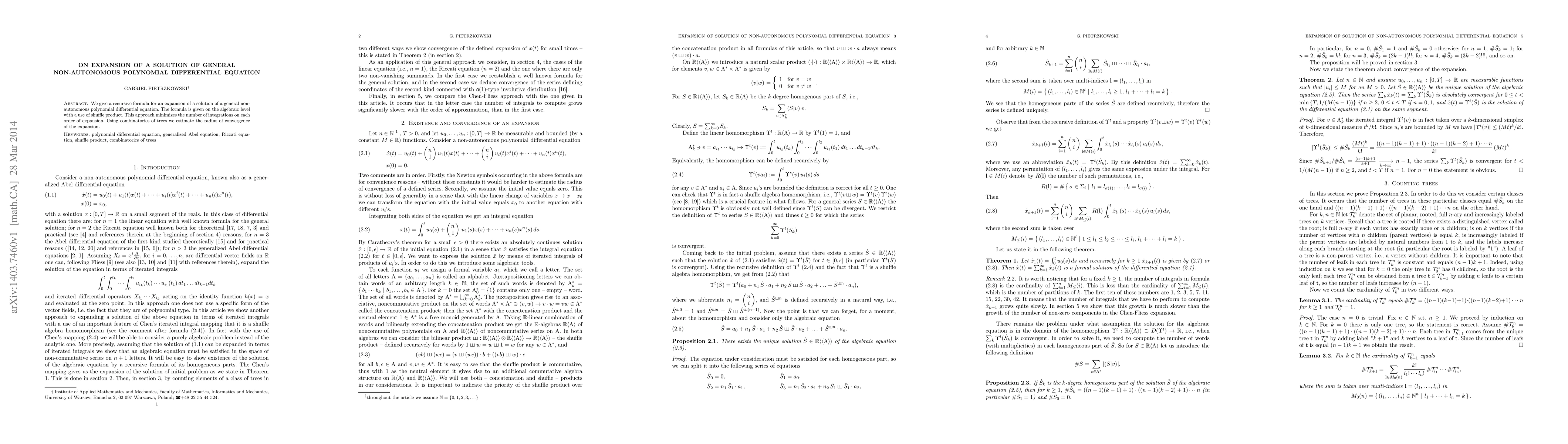 We give a recursive formula for an expansion of a solution of a general non-autonomous polynomial differential equation. The formula is given on the algebraic level with a use of shuffle product. This approach minimizes the number of integrations on each order of expansion. Using combinatorics of trees we estimate the radius of convergence of the expansion.