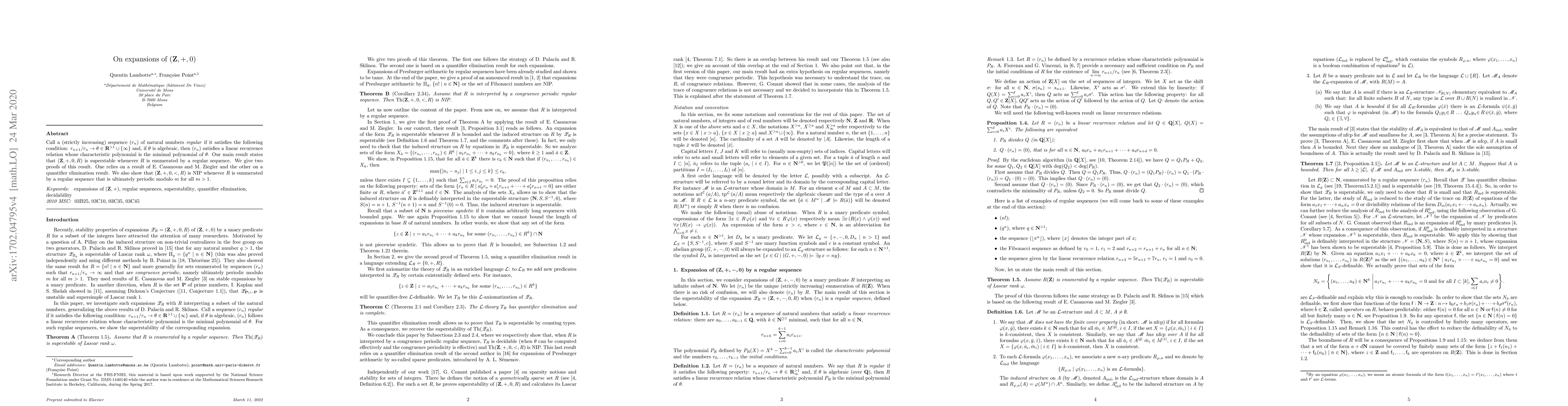 Call a (strictly increasing) sequence $(r_{n})$ of natural numbers \emph{regular} if it satisfies the following condition: $r_{n+1}/r_{n}\to\theta\in\mathbb{R}^{>1}\cup\{\infty\}$ and, if $\theta$ is algebraic, then $(r_{n})$ satisfies a linear recurrence relation whose characteristic polynomial is the minimal polynomial of $\theta$. Our main result states that $(\mathbb{Z},+,0,R)$ is superstable whenever $R$ is enumerated by a regular sequence. We give two proofs of this result. One relies on a result of E. Casanovas and M. Ziegler and the other on a quantifier elimination result. We also show that $(\mathbb{Z},+,0,<,R)$ is NIP whenever $R$ is enumerated by a regular sequence that is ultimately periodic modulo $m$ for all $m>1$.