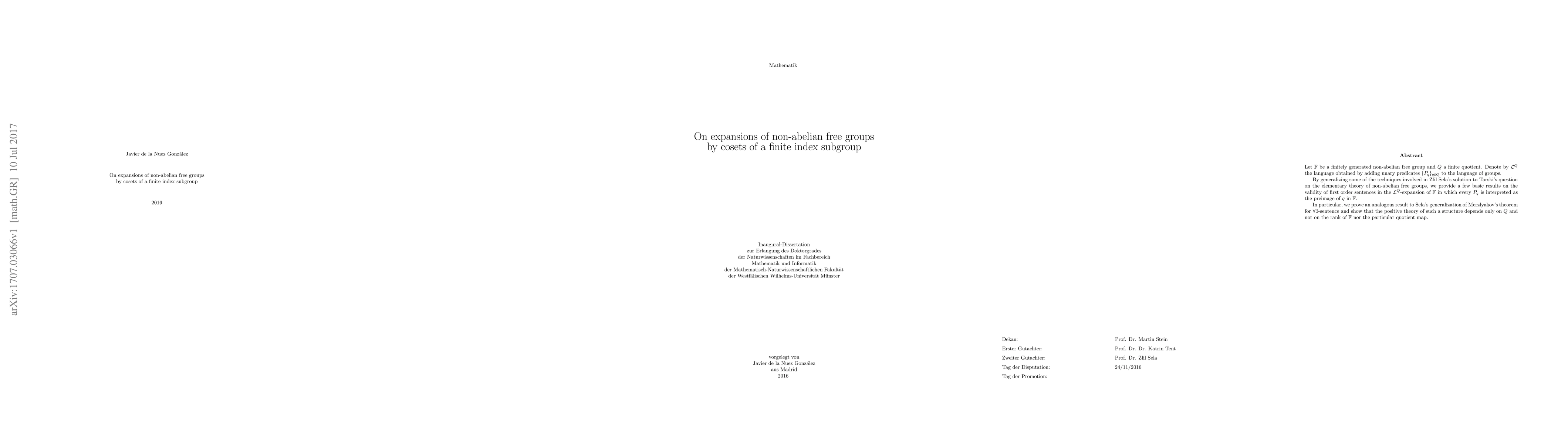 This paper explores the first-order validity of sentences in the $L_Q$-expansion of a finitely generated non-abelian free group $F$, where $Q$ is a finite quotient and $L_Q$ is a language augmented with unary predicates for elements of $Q$. It generalizes techniques from Zlil Sela's work on the elementary theory of free groups to prove results analogous to Sela's generalization of Merzlyakov's theorem on $\forall\exists$-sentences, showing that the positive theory depends solely on $Q$.
