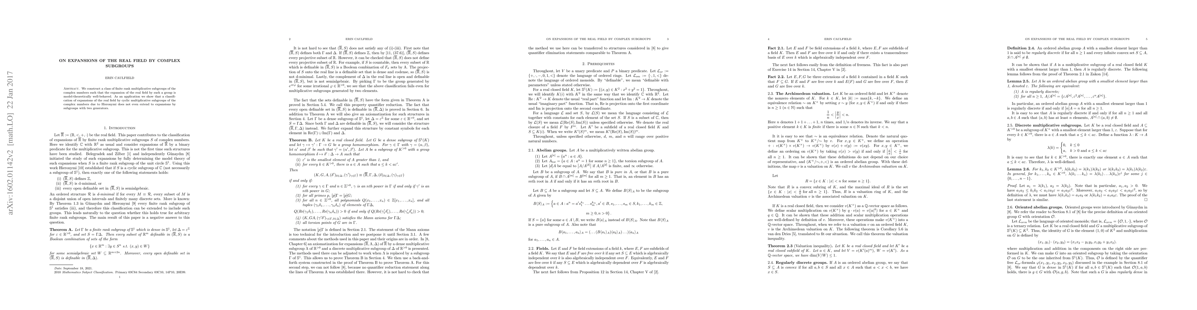 This research constructs specific finite rank multiplicative subgroups of complex numbers, showing their expansions of the real field are model-theoretically stable. It also highlights that a previous classification of real field expansions by cyclic subgroups doesn't generalize to subgroups with multiple generators.