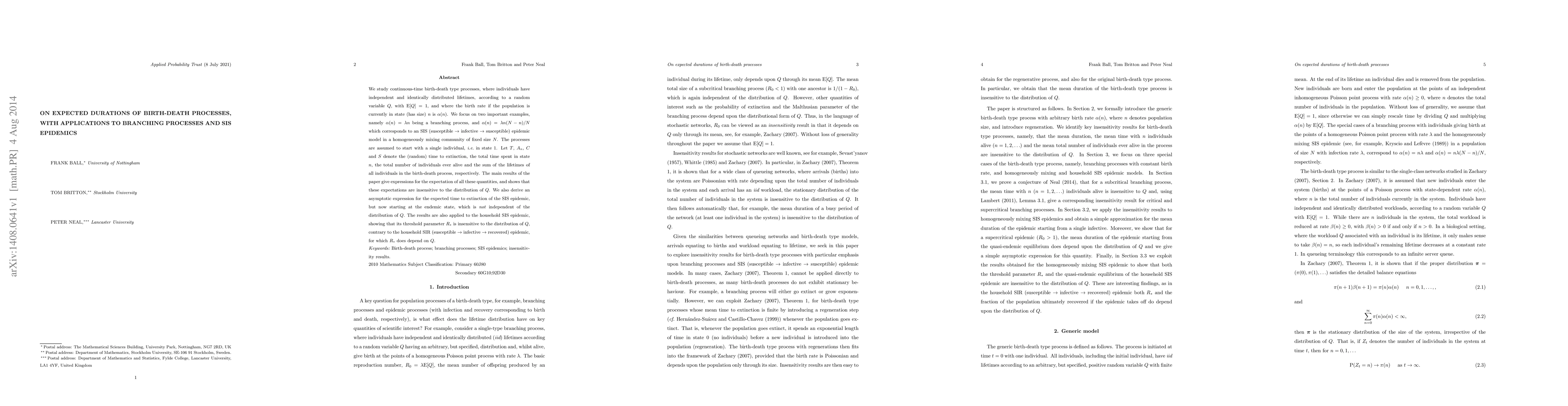 This paper examines birth-death processes, finding that key expectations like extinction time, population size over time, total individuals alive, and total lifetimes are unaffected by the lifetime distribution Q. It applies these findings to branching processes and SIS epidemics, revealing that certain critical parameters like the threshold for household SIS epidemics remain constant regardless of Q. The expected extinction time for SIS epidemics starting at the endemic state, however, does depend on Q.