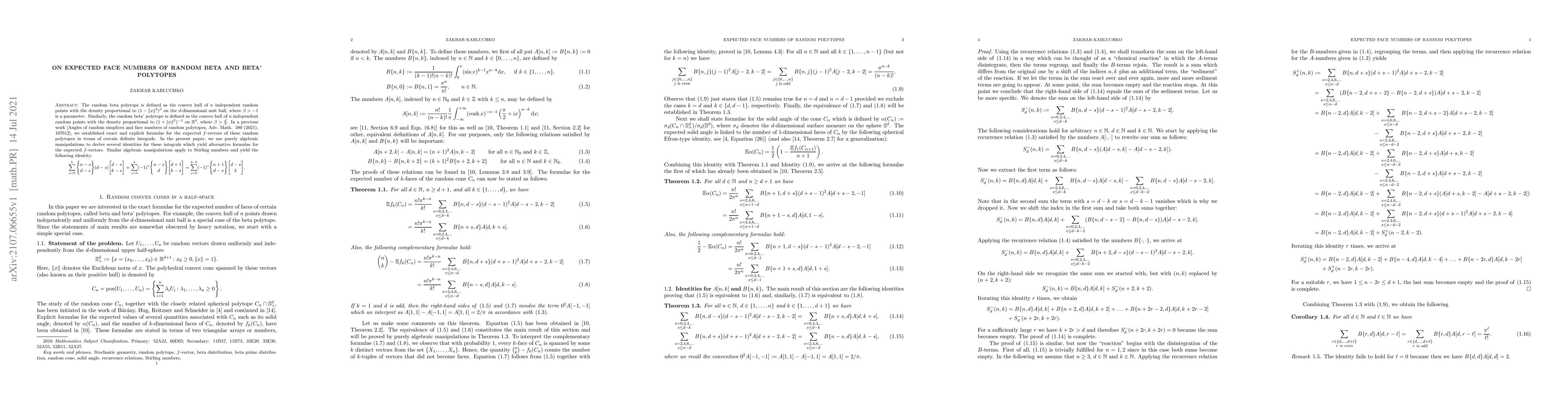 The random beta polytope is defined as the convex hull of $n$ independent random points with the density proportional to $(1-\|x\|^2)^\beta$ on the $d$-dimensional unit ball, where $\beta>-1$ is a parameter. Similarly, the random beta' polytope is defined as the convex hull of $n$ independent random points with the density proportional to $(1+\|x\|^2)^{-\beta}$ on $\mathbb R^d$, where $\beta>\frac d2$. In a previous work [Angles of random simplices and face numbers of random polytopes, Adv. Math., 380 (2021), 107612], we established exact and explicit formulae for the expected $f$-vectors of these random polytopes in terms of certain definite integrals. In the present paper, we use purely algebraic manipulations to derive several identities for these integrals which yield alternative formulae for the expected $f$-vectors. Similar algebraic manipulations apply to Stirling numbers and yield the following identity: $$ \sum_{s=0}^k \genfrac{\{}{\}}{0pt}{}{n-s}{d-s} (d-s) \genfrac{[}{]}{0pt}{}{d-s}{k-s} = \sum_{s=0}^k (-1)^s \genfrac{\{}{\}}{0pt}{}{n-s}{d} \genfrac{[}{]}{0pt}{}{d+1}{k-s} = \sum_{s=0}^{d-k} (-1)^s \genfrac{\{}{\}}{0pt}{}{n+1}{d-s} \genfrac{[}{]}{0pt}{}{d-s}{k}. $$