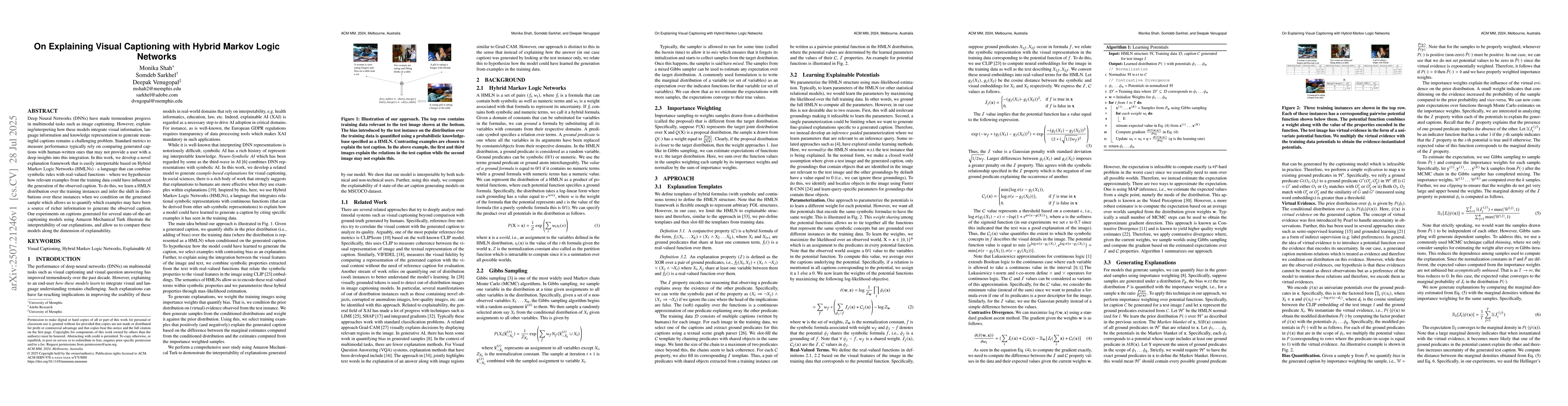 Deep Neural Networks (DNNs) have made tremendous progress in multimodal tasks such as image captioning. However, explaining/interpreting how these models integrate visual information, language information and knowledge representation to generate meaningful captions remains a challenging problem. Standard metrics to measure performance typically rely on comparing generated captions with human-written ones that may not provide a user with a deep insights into this integration. In this work, we develop a novel explanation framework that is easily interpretable based on Hybrid Markov Logic Networks (HMLNs) - a language that can combine symbolic rules with real-valued functions - where we hypothesize how relevant examples from the training data could have influenced the generation of the observed caption. To do this, we learn a HMLN distribution over the training instances and infer the shift in distributions over these instances when we condition on the generated sample which allows us to quantify which examples may have been a source of richer information to generate the observed caption. Our experiments on captions generated for several state-of-the-art captioning models using Amazon Mechanical Turk illustrate the interpretability of our explanations, and allow us to compare these models along the dimension of explainability.