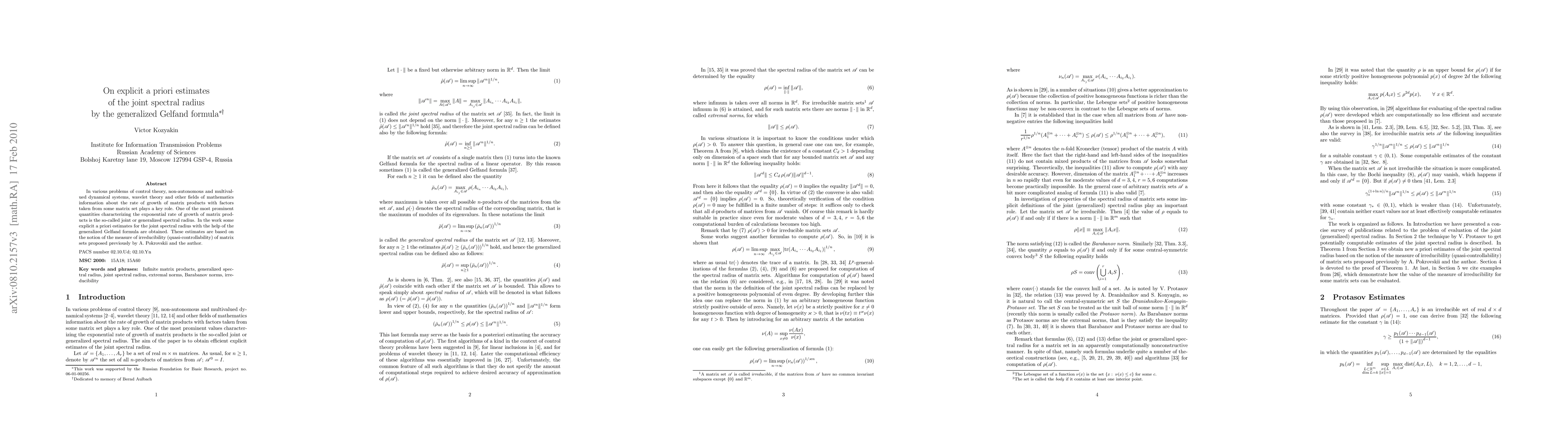 This paper provides explicit a priori estimates for the joint spectral radius using the generalized Gelfand formula, leveraging the measure of irreducibility (quasi-controllability) of matrix sets. These estimates are crucial for understanding the exponential growth rate in matrix products across various fields including control theory and wavelet theory.