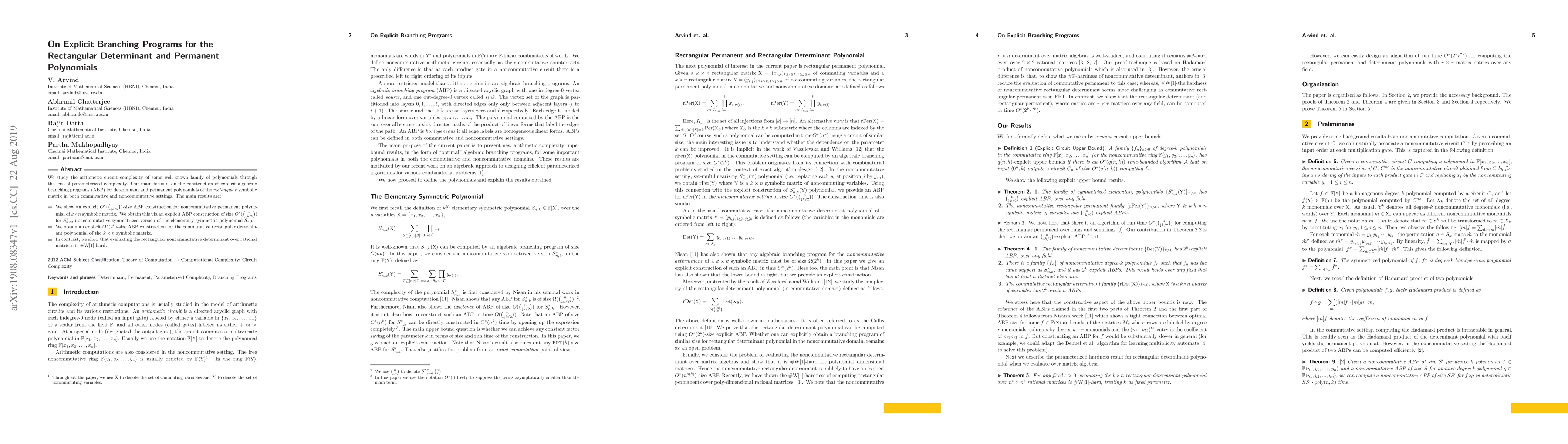 This research constructs explicit algebraic branching programs (ABP) for rectangular determinant and permanent polynomials, achieving: 1. An $O^{*}({n\choose {\downarrow k/2}})$-size ABP for the noncommutative permanent. 2. An $O^{*}(2^k)$-size ABP for the commutative rectangular determinant. It also demonstrates $W[1]$-hardness for evaluating the rectangular noncommutative determinant.