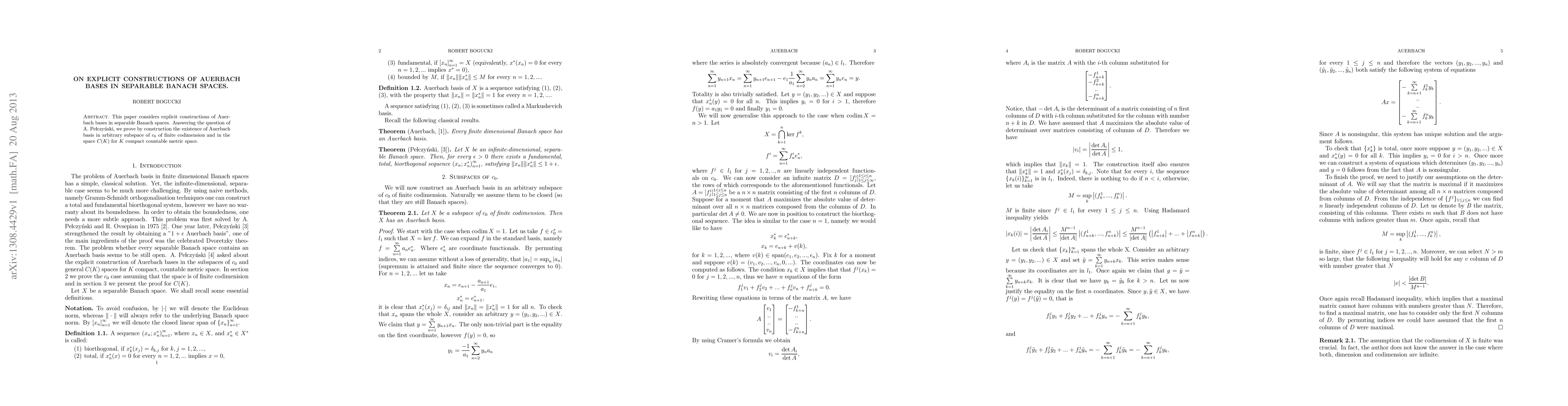 This paper considers explicit constructions of Auerbach bases in separable Banach spaces. Answering the question of A. Pe{\l}czy{\'n}ski, we prove by construction the existence of Auerbach basis in arbitrary subspace of $c_0$ of finite codimension and in the space $C(K)$ for $K$ compact countable metric space.