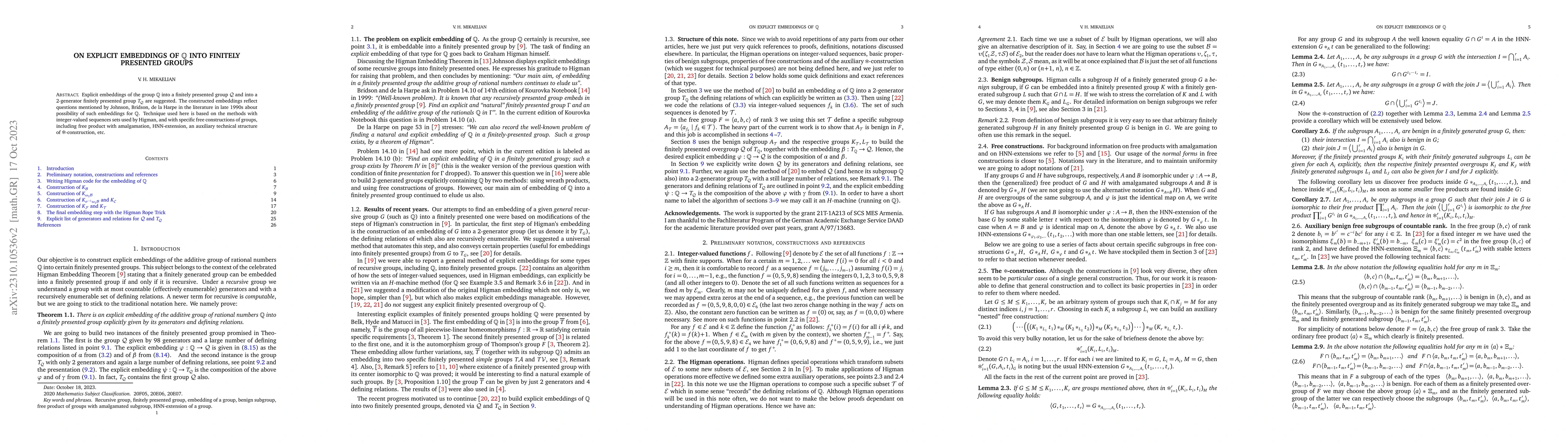 This paper proposes explicit embeddings of the rational numbers group $\mathbb{Q}$ into a finitely presented group $\mathcal{Q}$ and a 2-generator group $T_{\mathcal{Q}}$, employing techniques from Higman’s methods and free group constructions like amalgamations and HNN-extensions. The constructions address questions raised in the late 1990s by Johnson, Bridson, and de la Harpe regarding the feasibility of such embeddings for $\mathbb{Q}$.