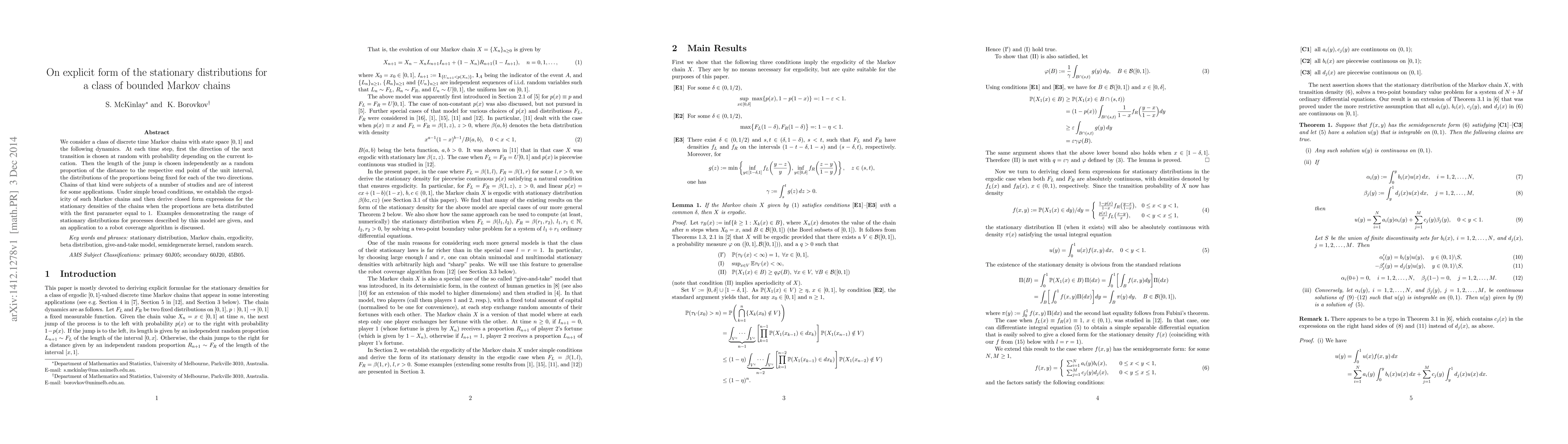 We consider a class of discrete time Markov chains with state space [0,1] and the following dynamics. At each time step, first the direction of the next transition is chosen at random with probability depending on the current location. Then the length of the jump is chosen independently as a random proportion of the distance to the respective end point of the unit interval, the distributions of the proportions being fixed for each of the two directions. Chains of that kind were subjects of a number of studies and are of interest for some applications. Under simple broad conditions, we establish the ergodicity of such Markov chains and then derive closed form expressions for the stationary densities of the chains when the proportions are beta distributed with the first parameter equal to 1. Examples demonstrating the range of stationary distributions for processes described by this model are given, and an application to a robot coverage algorithm is discussed.