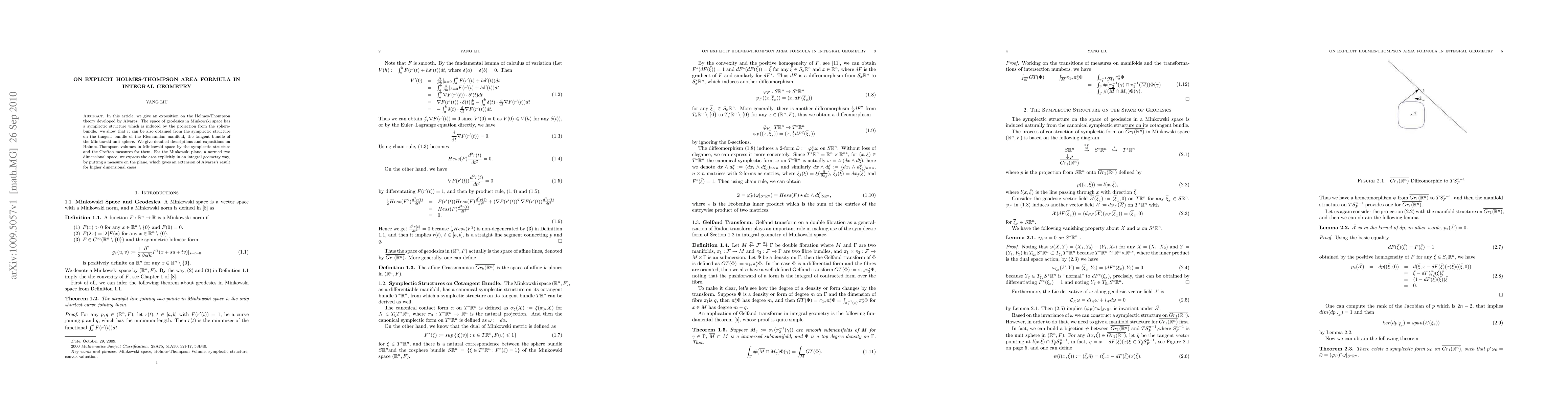 This paper explores the Holmes-Thompson theory in integral geometry, demonstrating how the symplectic structure on the space of geodesics in Minkowski space can be derived from the tangent bundle of the Minkowski unit sphere. It provides an explicit formula for the area in the Minkowski plane using integral geometry.