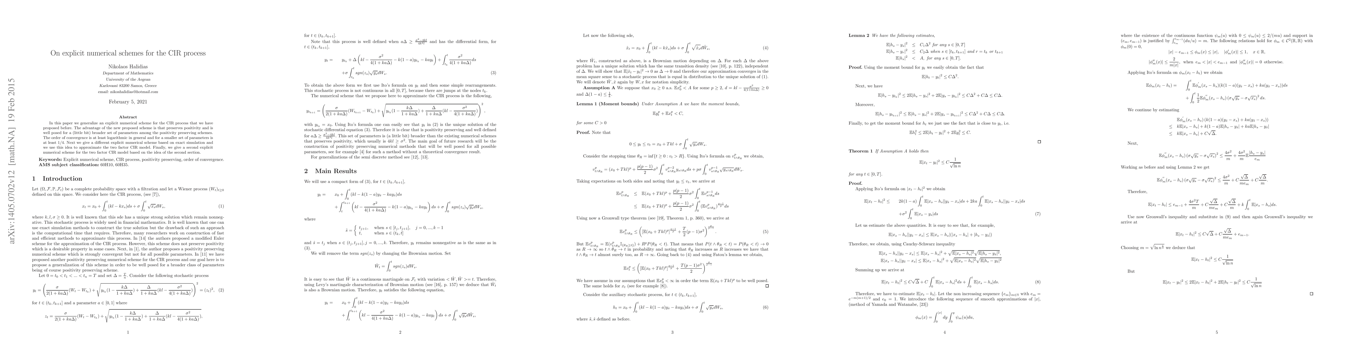 A new explicit numerical scheme for the CIR process is proposed, offering improved positivity preservation and convergence order compared to previous schemes.