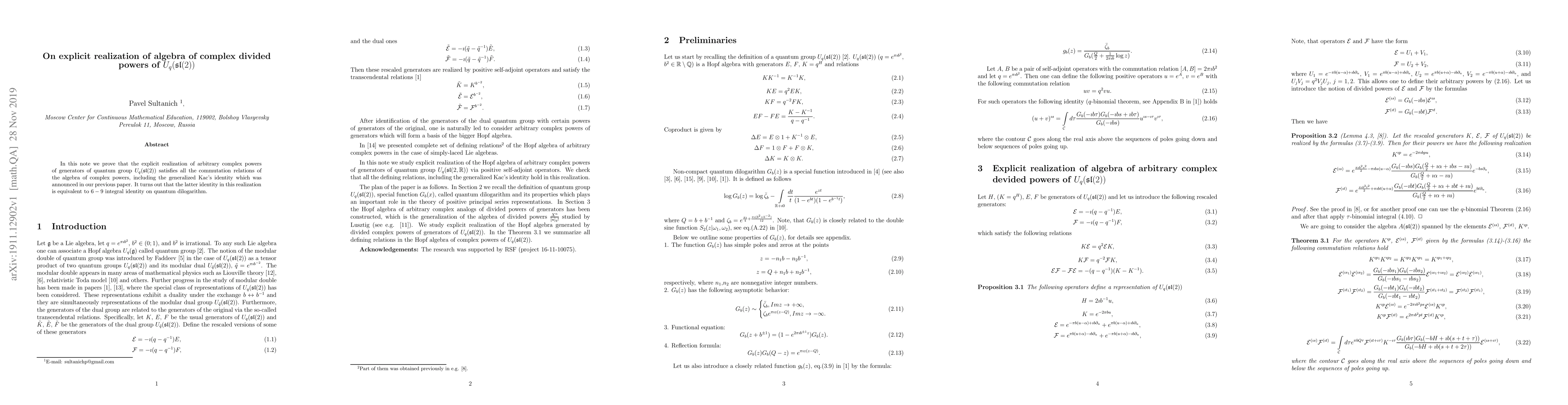 In this note we prove that the explicit realization of arbitrary complex powers of generators of quantum group $U_{q}(\mathfrak{sl}(2))$ satisfies all the commutation relations of the algebra of complex powers, including the generalized Kac's identity which was announced in our previous paper. It turns out that the latter identity in this realization is equivalent to $6-9$ integral identity on quantum dilogarithm.