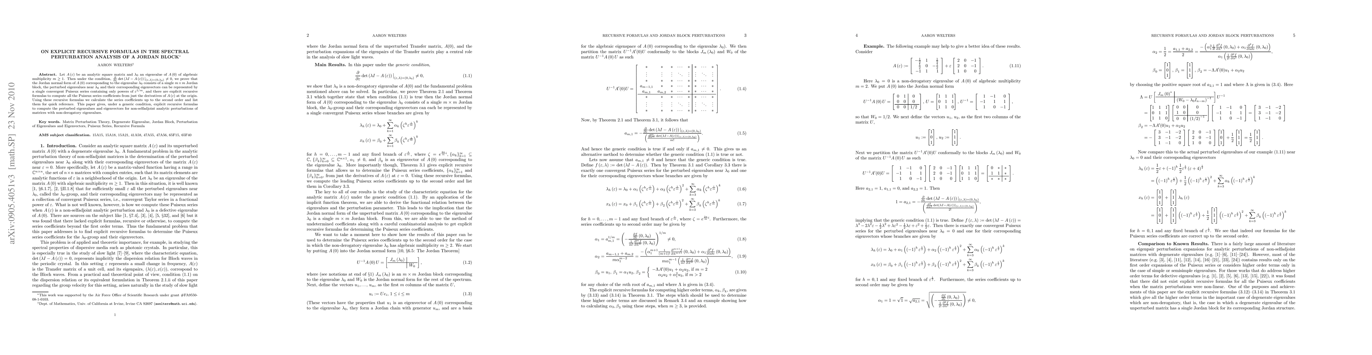 Let A(z) be an analytic square matrix and $\lambda_{0}$ an eigenvalue of A(0) of multiplicity m. Then under the generic condition, the characteristic polynomial of A(z) evaluated at $\lambda_{0}$ has a simple zero at z=0, we prove that the Jordan normal form of A(0) corresponding to the eigenvalue $\lambda_{0}$ consists of a single m-by-m Jordan block, the perturbed eigenvalues near $\lambda_{0}$ and their eigenvectors can be represented by a single convergent Puiseux series containing only powers of z^{1/m}, and there are explicit recursive formulas to compute all the Puiseux series coefficients from just the derivatives of A(z) at the origin. Using these recursive formulas we calculate the series coefficients up to the second order and list them for quick reference. This paper gives, under a generic condition, explicit recursive formulas to compute the perturbed eigenvalues and eigenvectors for non-selfadjoint analytic perturbations of matrices with degenerate eigenvalues.
