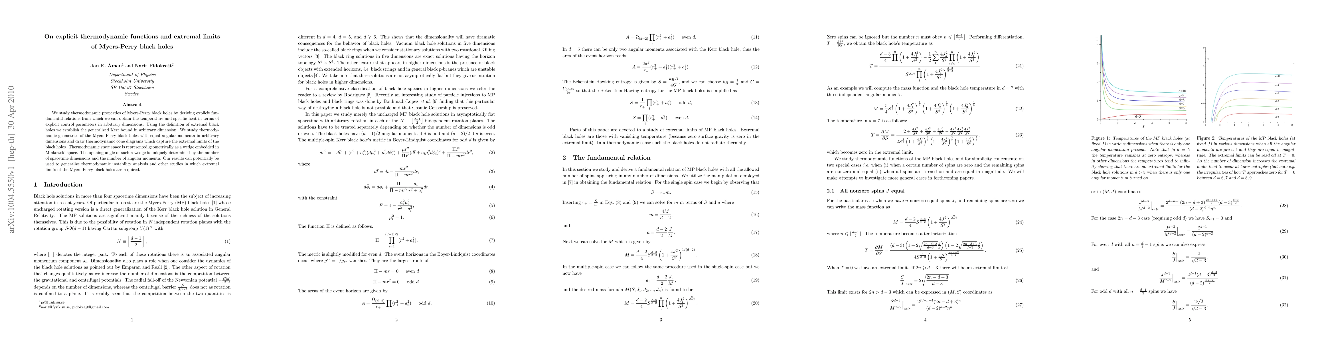 This paper derives explicit thermodynamic relations for Myers-Perry black holes, establishing a generalized Kerr bound and studying their extremal limits in arbitrary dimensions. It also introduces a geometric representation of the thermodynamic state space as a wedge in Minkowski space, which uniquely depends on spacetime dimensions and angular momenta.