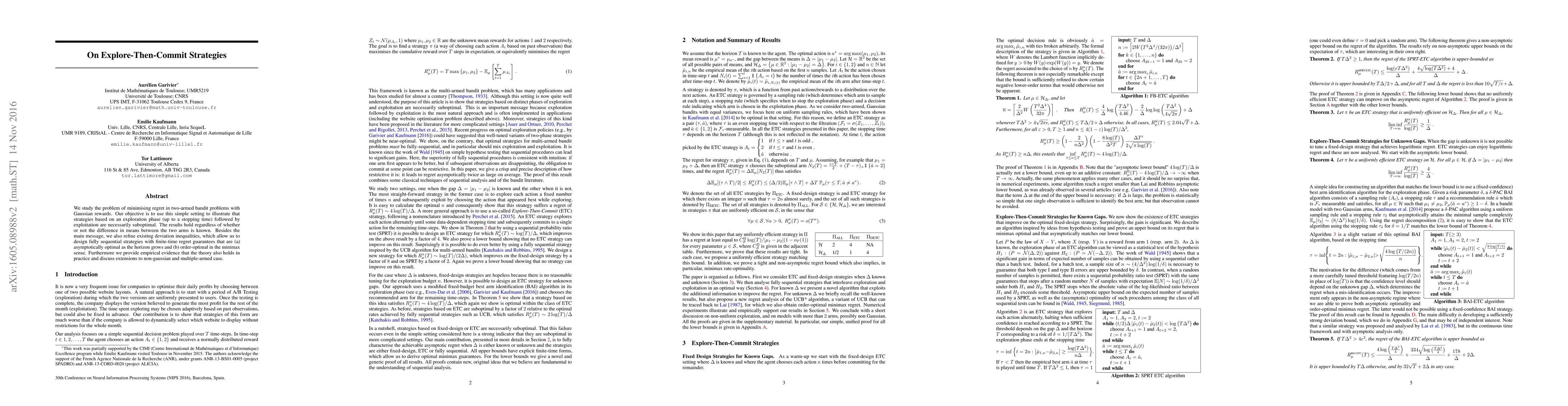 We study the problem of minimising regret in two-armed bandit problems with Gaussian rewards. Our objective is to use this simple setting to illustrate that strategies based on an exploration phase (up to a stopping time) followed by exploitation are necessarily suboptimal. The results hold regardless of whether or not the difference in means between the two arms is known. Besides the main message, we also refine existing deviation inequalities, which allow us to design fully sequential strategies with finite-time regret guarantees that are (a) asymptotically optimal as the horizon grows and (b) order-optimal in the minimax sense. Furthermore we provide empirical evidence that the theory also holds in practice and discuss extensions to non-gaussian and multiple-armed case.